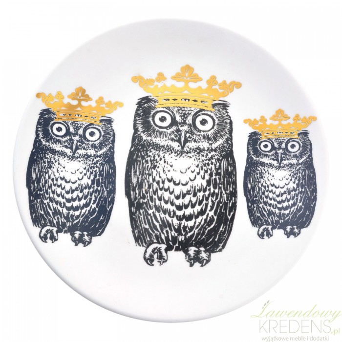 Dekoracyjne, płaskie talerzyki deserowe od Clayre&Eef wykonano z ceramiki i ozdobiono trzema sowami w koronach.