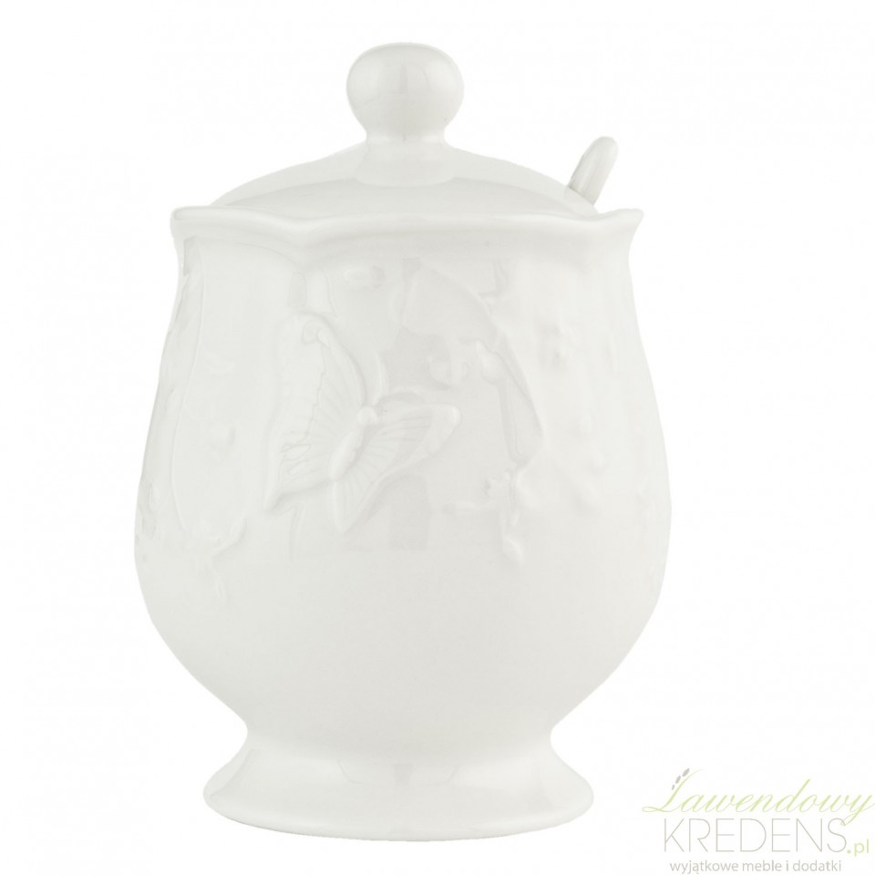Cukiernica prowansalska z okrągłą przykrywką i zdobieniami w formie motyli to pomysł na naturalny dodatek na każdy stół i stolik kawowy.