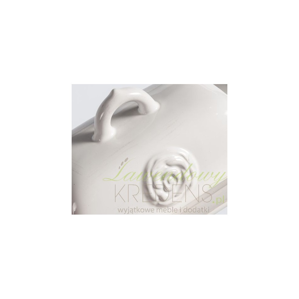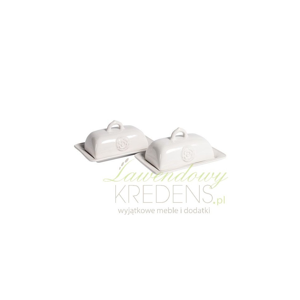 Ceramiczna maselnica w białym kolorze to propozycja znanej marki Belldeco. Przedmiot posiada interesujący kształt, co nadaje mu oryginalności. Zdobienie zaś przyciąga wzrok – to wygrawerowana grafika róży o rozłożystych płatkach. Cudeńko!