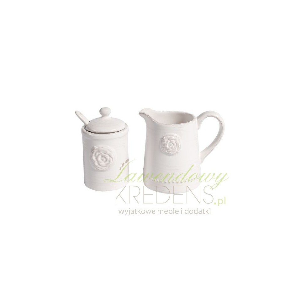 Ujmujący zestawik: mlecznik i cukiernica z pokrywką i łyżeczką do kompletu. Wykonane z doskonałej ceramiki, pomalowane na biało i lakierowane ozdobione zostały uwypuklonym kwiatem kwitnącej róży, która jest znakiem charakterystycznym serii Sorrento. Umil sobie poranne czy wieczorne delektowanie sie kawą czy herbatą za pomocą zestawu marki Belldeco!