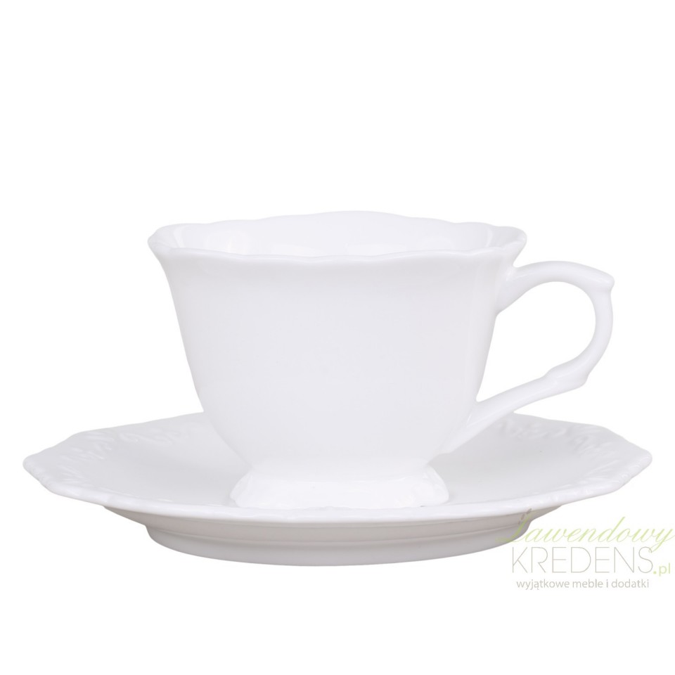 Prezentujemy niezwykle delikatne i eleganckie małe filiżanki w stylu prowansalskim. Ich subtelny kształt ze zdobioną podstawą w połączeniu z białym spodeczkiem wygląda niezwykle i przyciąga wzrok.