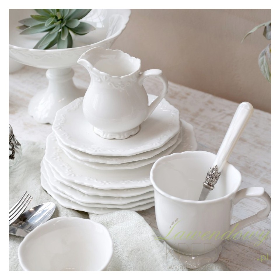 Porcelana w stylu prowansalskim to śliczne i eleganckie produkty na każdy stół. Sosjerka prowansalska firmy Chic Antique wykonana jest z białej porcelany. Ma duże, praktyczne ucho do trzymania i nierówną, falistą krawędź u góry. Sosjerka w stylu prowansalskim cudownie będzie wyglądać wśród naczyń z tej samej kolekcji.