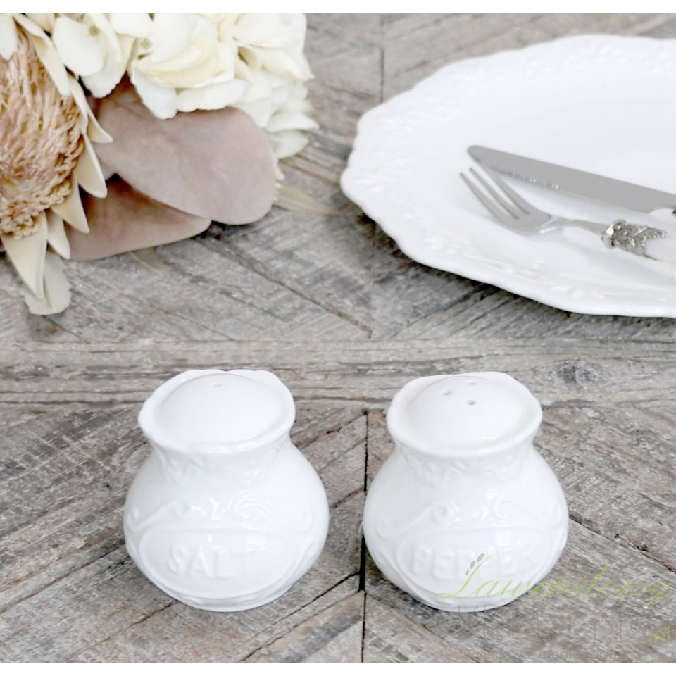 Śliczna, biała porcelana w stylu prowansalskim firmy Chic Antique w formie solniczki i pieprzniczki!