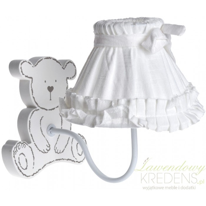 Kinkiet dziecięcy w stylu prowansalskim wyprodukowany został przez holenderską firmę. Kinkiet prowansalski posiada bawełniany klosz z falbanką i kokardką oraz metalowe i drewniane dodatki. Kinkiet z misiem doda uroku ścianie i wprowadzi światło do pokoju dziecięcego. Kinkiet to idealny zamiennik lamp stojących, dzięki nim zyskasz dodatkowe miejsce na podłodze!