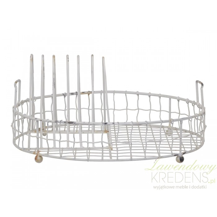 Ociekacz na naczynia został wykonany z metalu i pomalowany na biało. Dodatki w stylu prowansalskim dekorują antyczne przetarcia, które wyrażają klimat francuskich i prowansalskich elementów wyposażenia wnętrza. Metalowy ociekacz w kształcie okręgu z kratkowaną podstawą stabilnie opiera się na czterech zaokrąglonych nóżkach. Wewnątrz znajduje się miejsce na talerze oraz kubki bądź szklanki.
