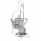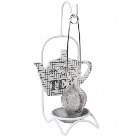 Doskonały do wykorzystania w kuchni zaparzacz do herbaty z ociekaczem ma przymocowany dekoracyjny czajniczek w kratkę z napisami.