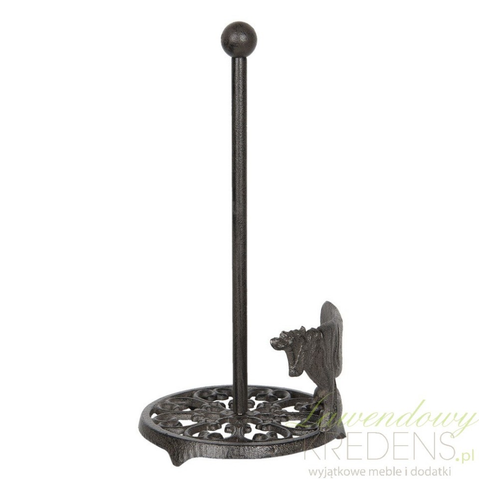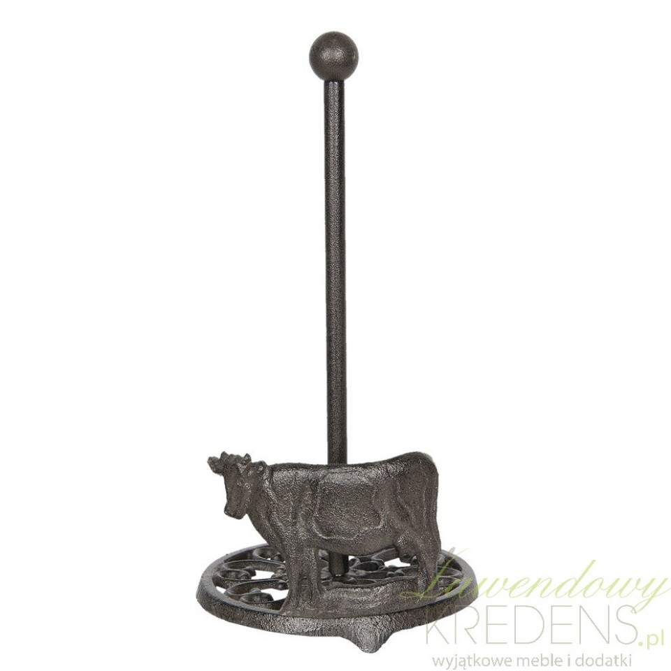 Metalowy stojak na ręcznik papierowy z krową to sposób na funkcjonalną kuchnię. Wykonany z metalu posiada dekoracje w formie ażurowej podstawy i metalowej krowy znajdującej się na jego bocznej krawędzi. Brązowy stojak na ręczniki kuchenne jest stabilny, wykonany w prowansalskim stylu co spodoba się z pewnością wielu paniom domu dbającym by domowe ognisko nigdy nie zgasło. Metalowe stojaki na papier -szukaj ich w ofercie holenderskiej marki Clayre&Eef.