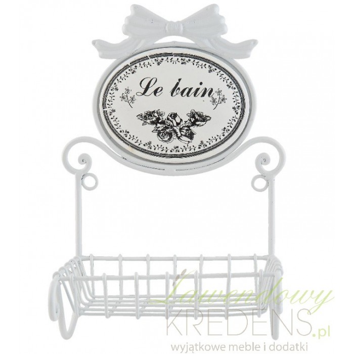 Dodatki do łazienki, a wśród nich wieszak na mydło to cudowna ozdoba łazienki stworzona w wyjątkowym stylu i klimacie. Mydelniczka do zawieszenia stworzona została w fantastycznym prowansalskim stylu i ma biały kolor. Góry posiada ozdobną kokardę i czarny farncuski napis Le Bain z uroczą różyczką.