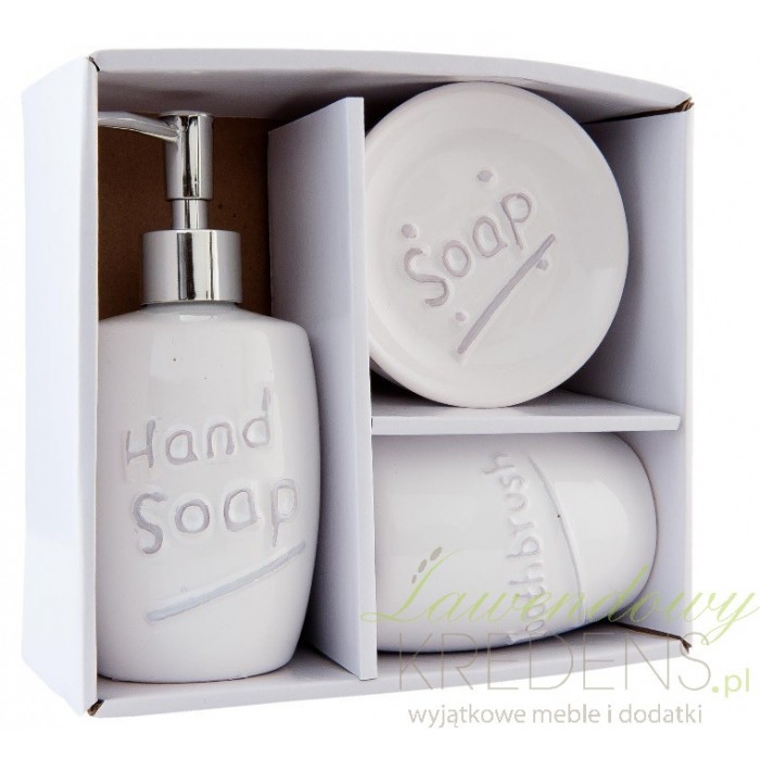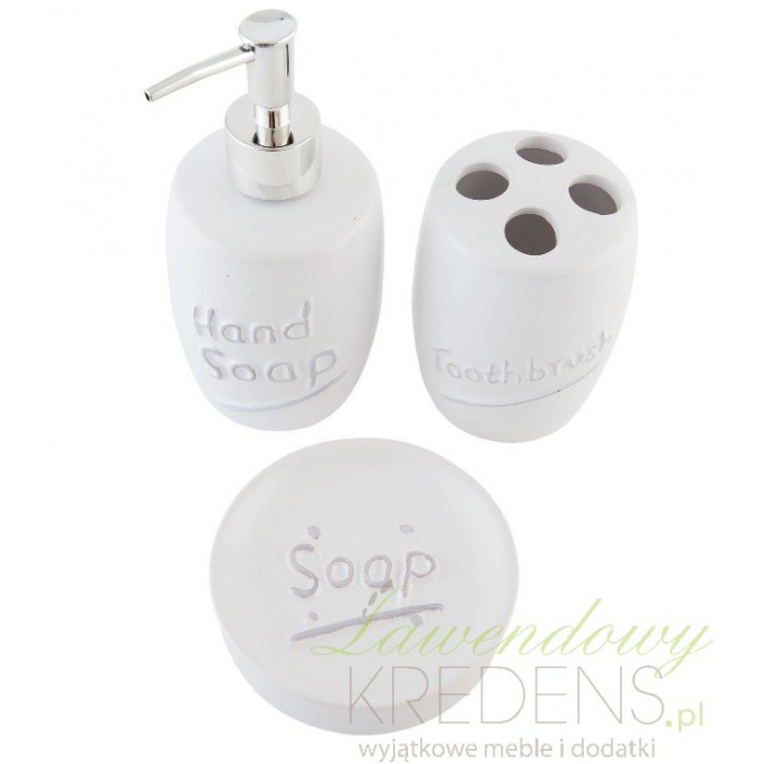 Przydatne akcesoria łazienkowe z serii Clayre&Eef w białym kolorze, dzięki neutralnej kolorystyce i poręcznym kształtom sprawdzają się w klasycznych wnętrzach. W prezentowanym zestawie znajduje się pojemnik i podstawka na mydło w kostce oraz kubek na szczoteczki i pastę do zębów. Każdy z elementów został wykonany z wysokiej jakości ceramiki i udekorowanym napisem określającym jego przeznaczenie. Subtelna barwa i minimalistyczna forma tworzą idealne połączenie.