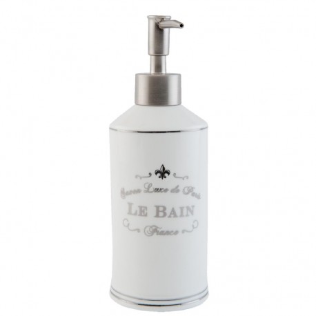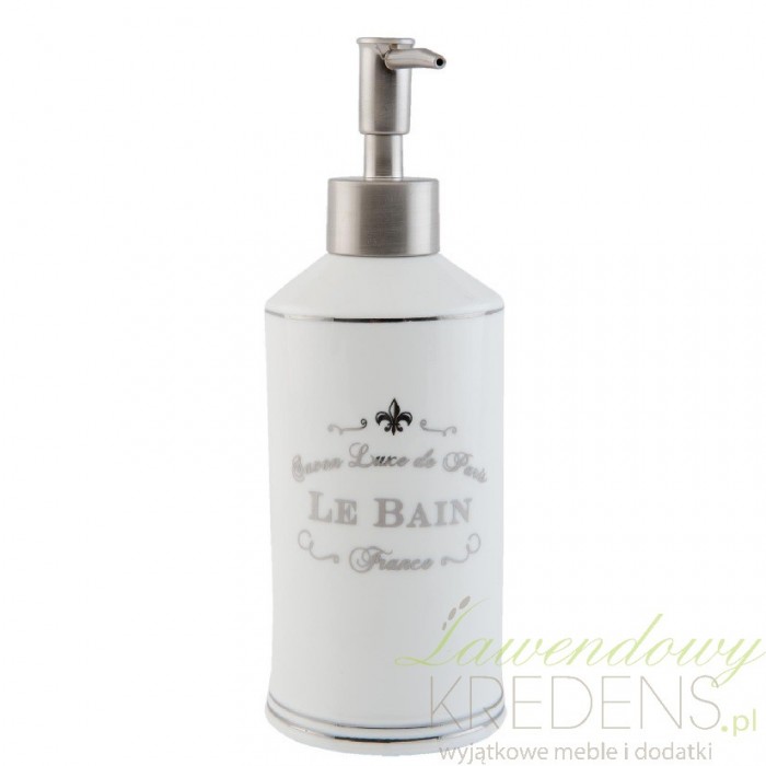 Ceramiczny dozownik na mydło posiadajacy srebrne ozdobne akcenty takie jak francuskie napisy i pompka. Rewelacja!
