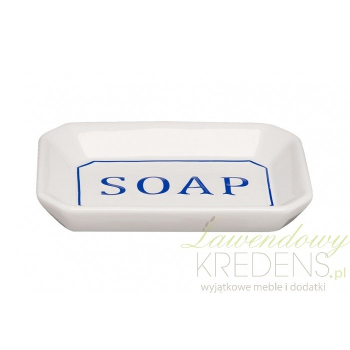 Prosta mydelniczka ma kształt prostokąta i lekko ścięte rogi. Na jej dnie znajduje się duży, niebieski napis SOAP. Mydelniczka z napisem w kolorze biało niebieskim to sposób na atrakcyjne i praktyczne wnętrze. Wszystko czego potrzebujesz do urządzenia łazienki znajdziesz w ofercie holenderskiej marki Clayre&Eef. Polecamy dodatki do łazienki słynące z prostoty!