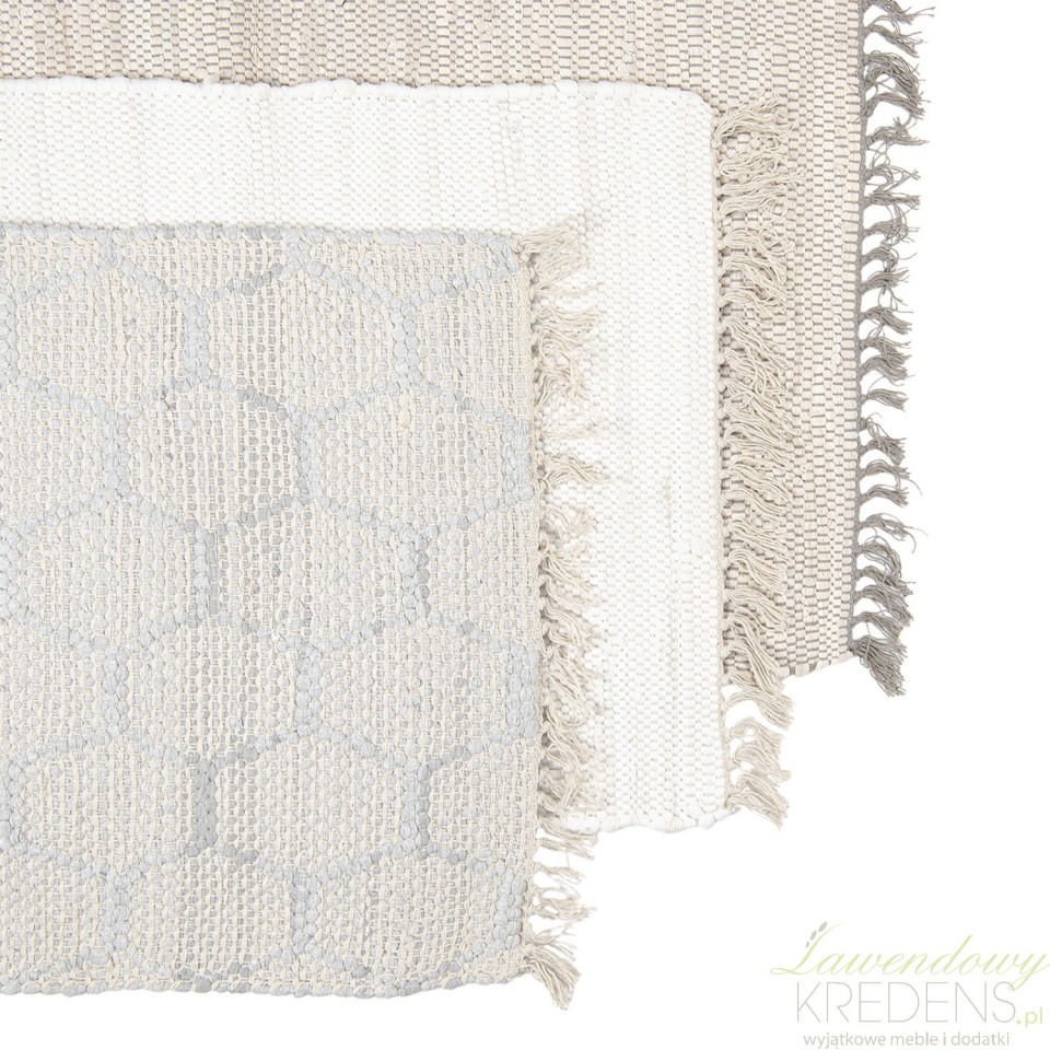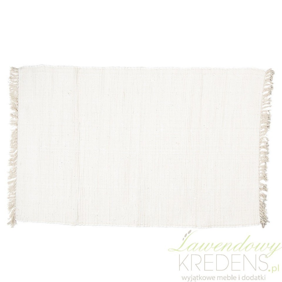 Biały, bawełniany dywanik w stylu skandynawskim z frędzlami jest prostokątny i uszyty w całości z miękkiej bawełny.