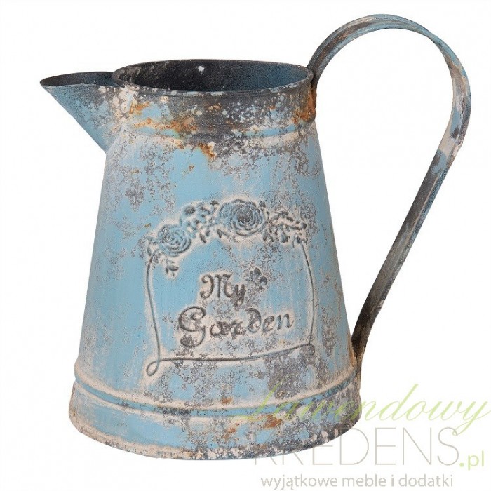 Dzbanek prowansalski z dziobkiem i uchwytem jest wykonany z metalu. Na froncie dzbanka znajdują się rzeźbione wzory i napisy. Niebieski odcień dzbanka zakłócają wszędzie widoczne, celowo naniesione postarzenia. Wybierz dzbanki ozdobne jako dodatki w stylu prowansalskim do ogrodu lub jako dzbanek na kwiaty.