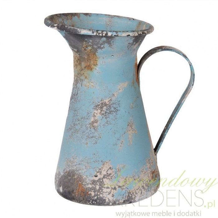 Niepowtarzalny dzbanek prowansalski z poręcznym uchwytem i zaokrągloną krawędzią. Dzbanek na kwiaty o pojemności jednego litra wykonano z żelaza, pomalowano na niebieski kolor, a w końcowym etapie postarzono obdrapaniami i rdzawymi plamami. Dzbanek to świetny pomysł na aranżację, która ma być antyczna i piękna. Wybierz dodatki w stylu prowansalskim do wnętrza, dzięki którym każdy wolna chwila spędzona w ogrodzie lub w domu stanie się niezwykle przyjemna.
