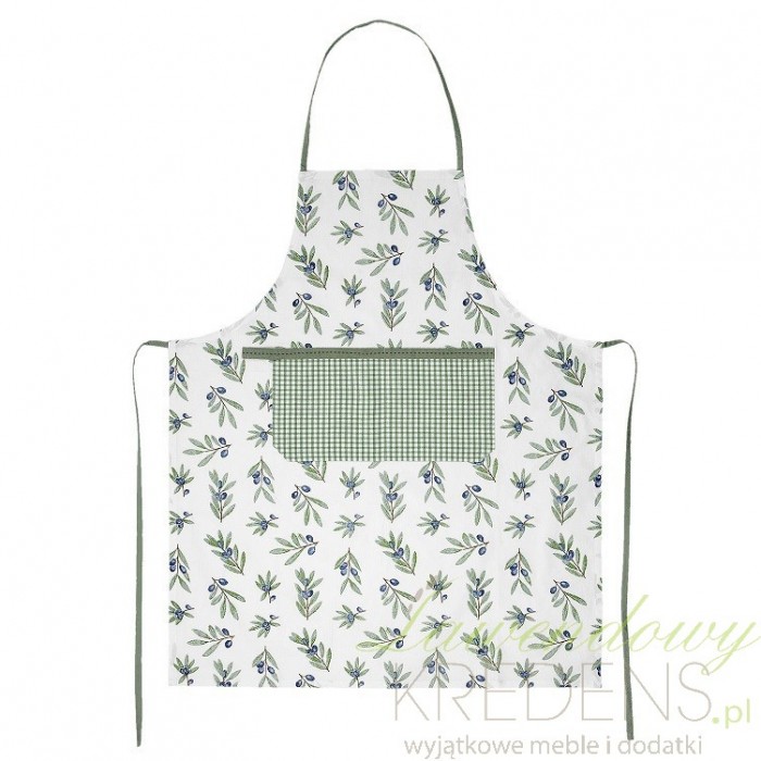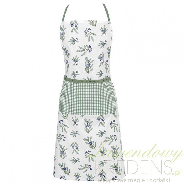 Bawełniany fartuszek do kuchni został wykonany w białym kolorze z elementami oliwkowymi. Ozdobiony jest grafiką dojrzałych oliwek na liściastych gałązkach, rozmieszczonych na całej długości fartuszka. Z przodu na wysokości pasa doszyto kraciastą kieszonke, co sprawia że fartuszek prowansalski to praktyczny i oryginalny dodatek do kuchni. Fartuszki do kuchni z charakterystycznymi wzorami pomogą Ci stworzyć wnętrze indywidualnie dopasowane do Ciebie!