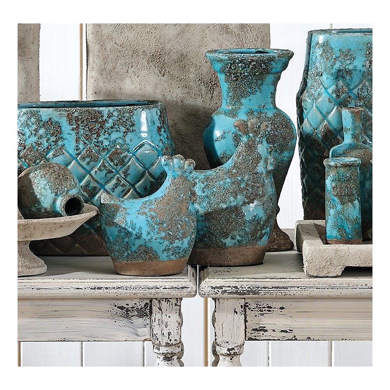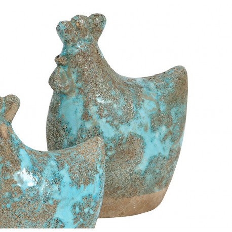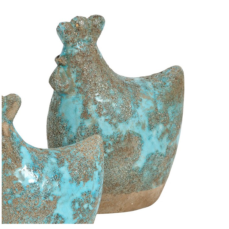Ozdobna figurka kury Azzurro Old firmy Belldeco o brązowo-błękitnej kolorystyce i ciekawie postarzanej, spękanej powierzchni. Figurka będzie świetnie wyglądać postawiona na półce lub komodzie oraz między donicami i wazonami z tej samej serii Azzurro Old Belldeco.