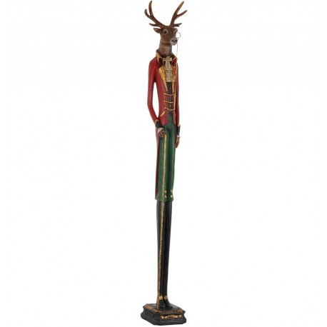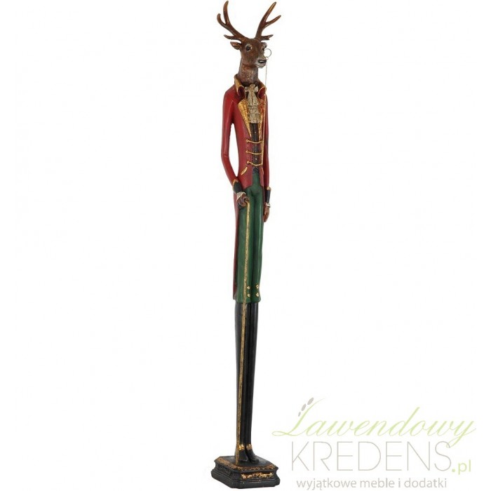 Figurka jelenia od Clayre&Eef sięgającą wysokości prawie 100cm, mimo tego że jest chuda nie da się nie zauważyć. Jeleń z rogami został ożywiony i ubrany w czerwoną marynarkę i zielone spodnie. Statuetka stabilnie trzyma się kwadratowej podstawy i będzie pasowała jako ozdoba francuskiego lub eleganckiego wnętrza. Takie dodatki do domu znajdziesz tylko w naszym sklepie.