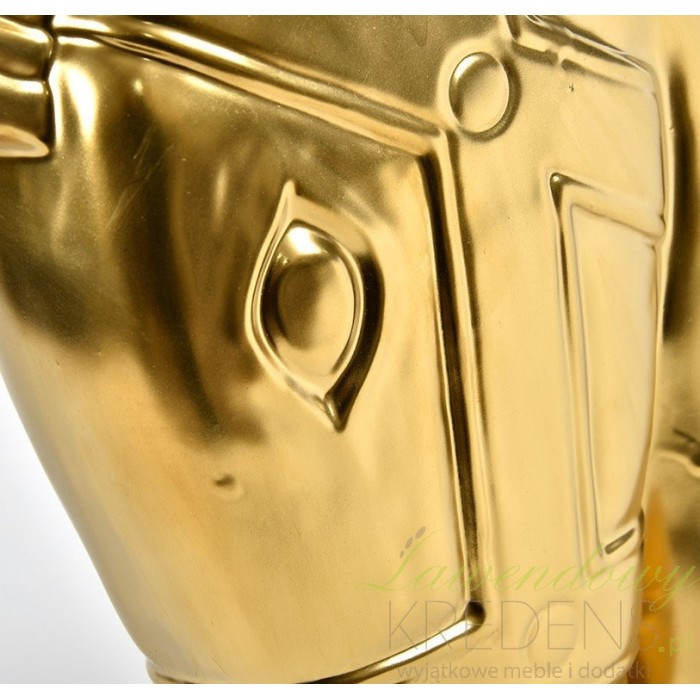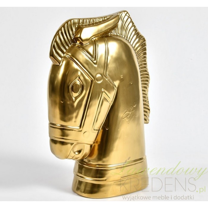 Figurka Belldeco w kształcie głowy konia została uformowana z ceramiki i pokryta złotą powłoką z przykuwającym uwagę połyskiem.