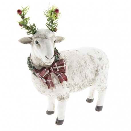 Figurka ozdobna od Clayre&Eef przedstawia białą owcę w szaliku z rogami zrobionymi z gałązek iglastego krzewu.