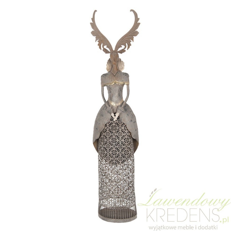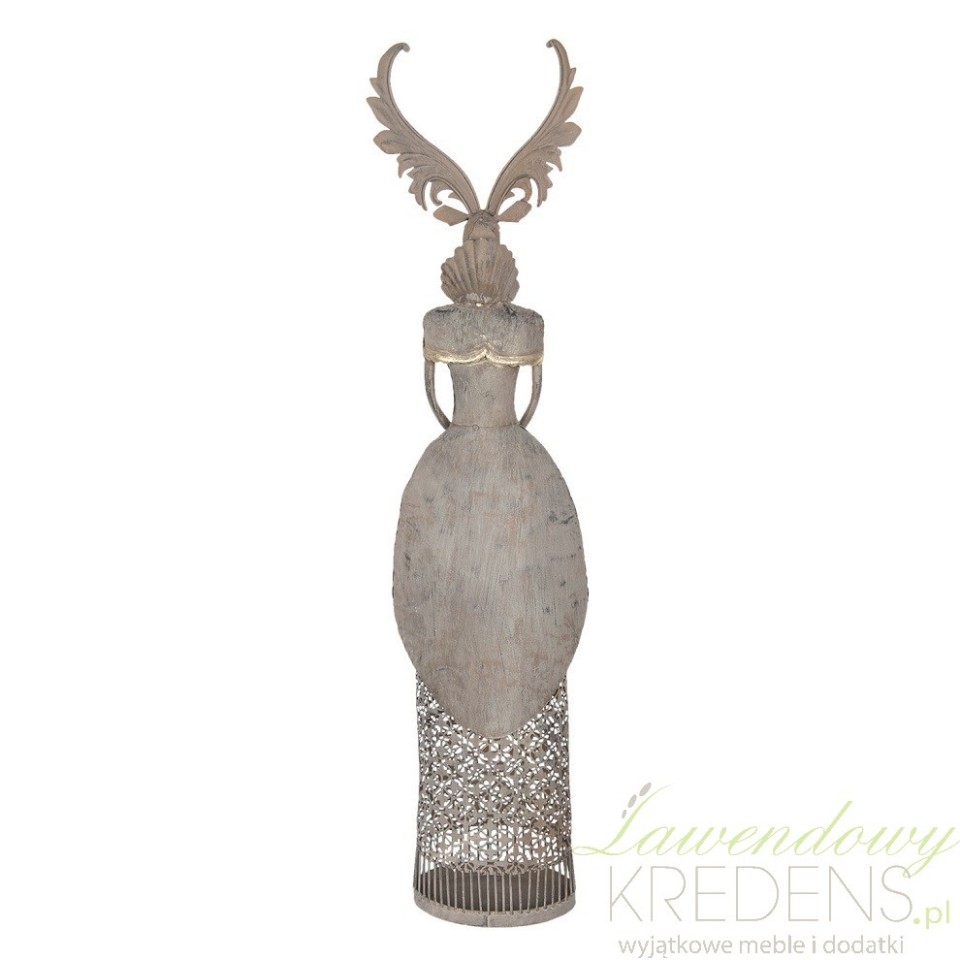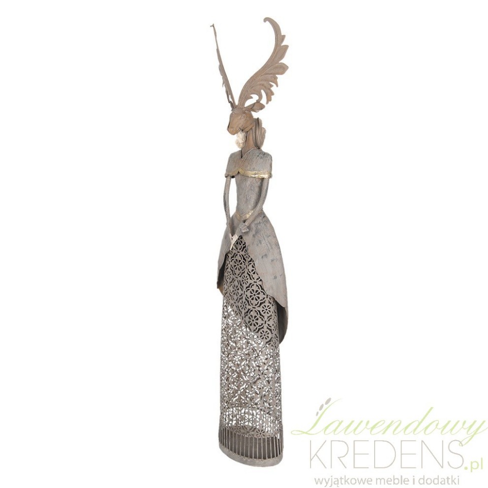 Niespotykana, metalowa figurka z motywem jelenich rogów wykonana z metalu w kolorze szarym. Figurka wygląda jak sylwetka wysokiej kobiety ubrana w ażurową sukienkę, przyciągająca wzrok ciekawą dekoracją głowy. Najlepiej będzie wyglądała zdobiąc metalową komodę lub drewniane półki ścienne. Duży rozmiar i niebanalny design sprawią, że nikt nie przejdzie obojętnie widząc ustawione na twoich meblach ozdobne figurki.