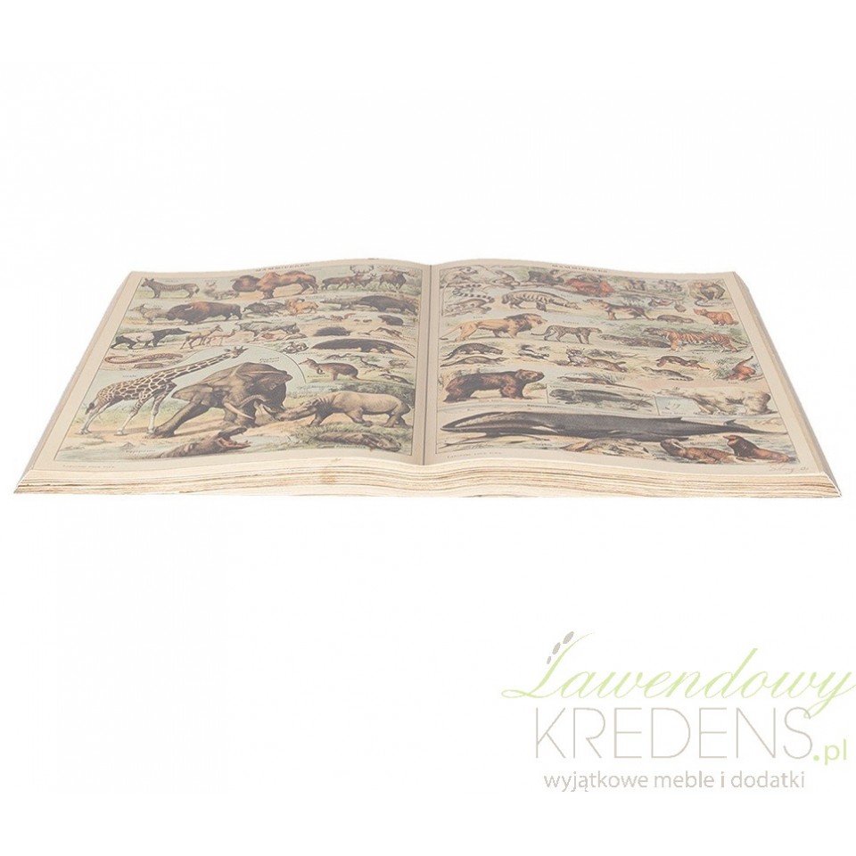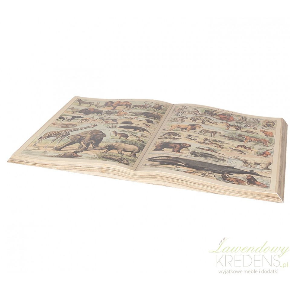 Otwarta książka ozdobna wykonana została z papieru i do złudzenia przypomina prawdziwą, starą księgę. Widoczne obrazki przedstawiają kilkanaście rodzajów zwierząt nadrukowanych na wyblakłych stronnicach. Książka ozdobna może zostać wykorzystana jako rekwizyt przy sesji zdjęciowej o tematyce retro.