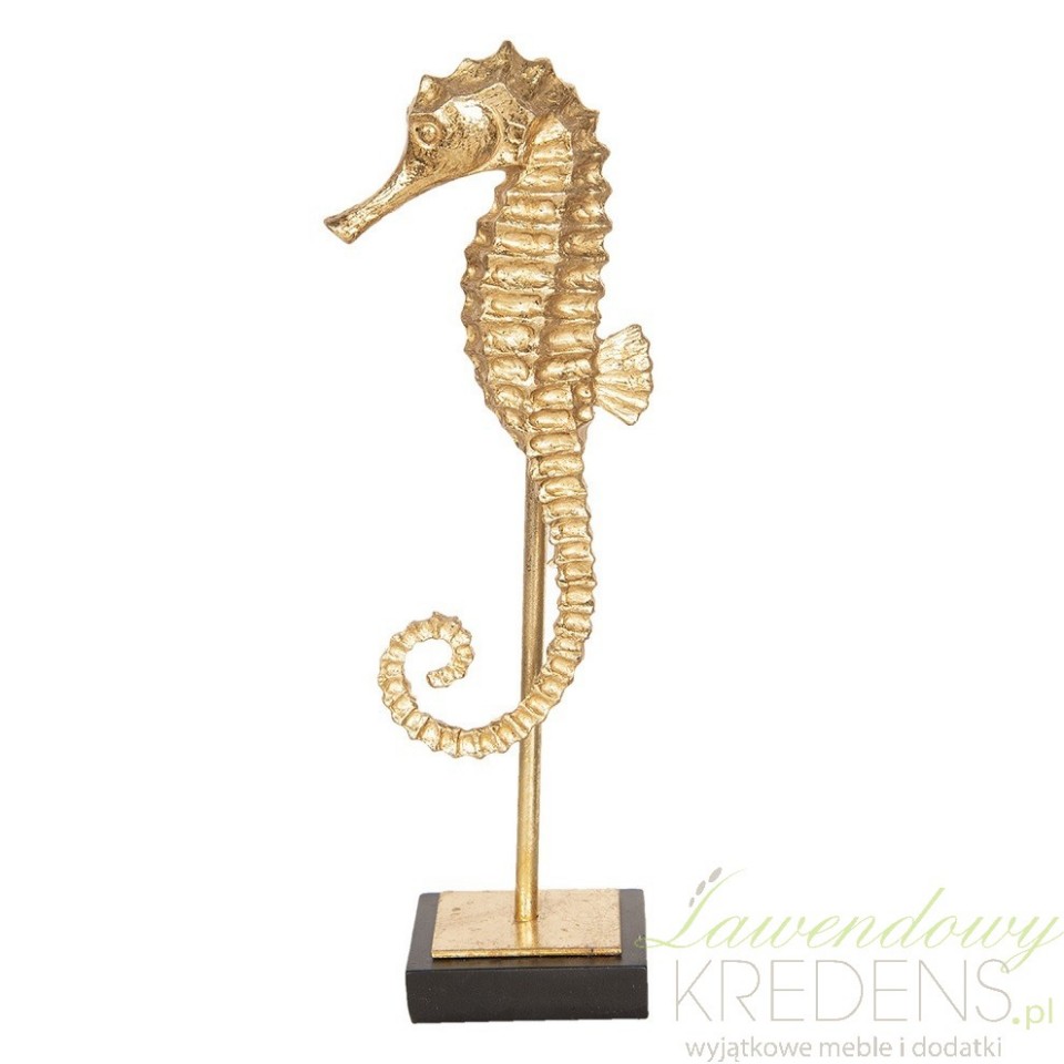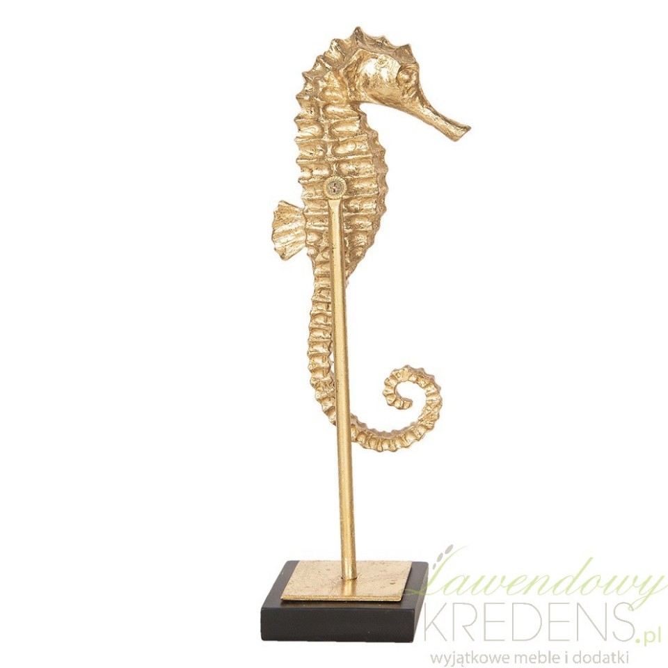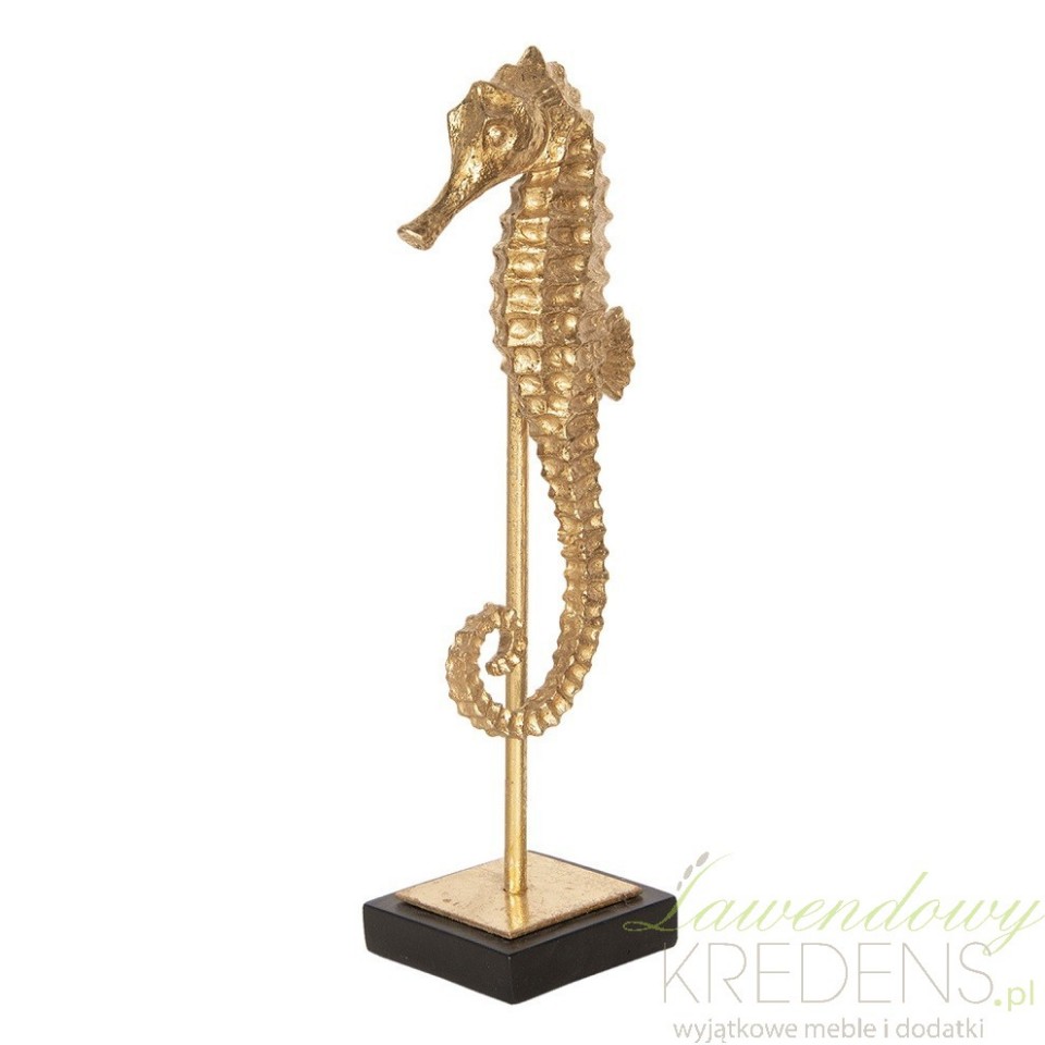 Artykuły dekoracyjne jakie polecamy do wnętrz w stylu marynistycznym to między innymi figurki zwierząt morskich takie jak na przykład figurka konik morski.