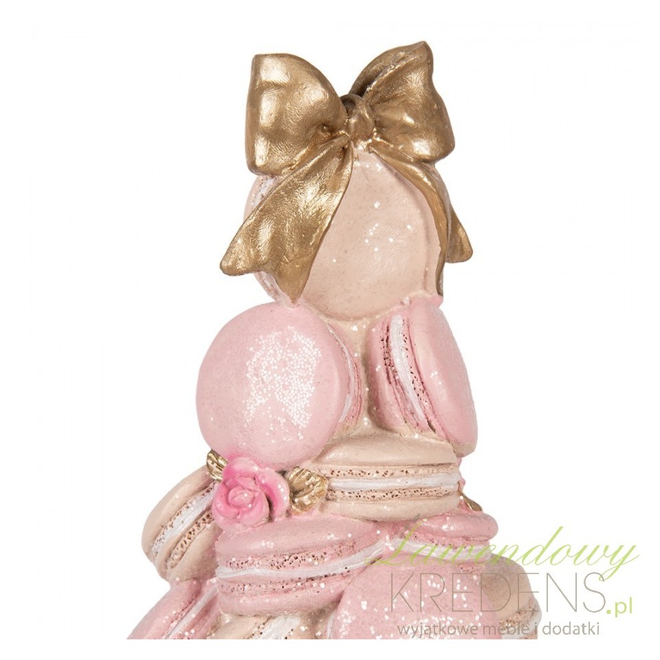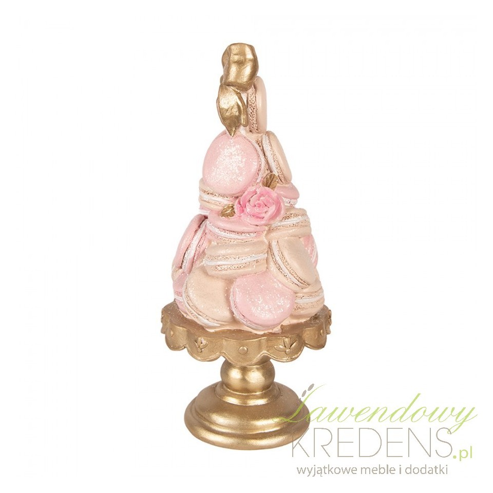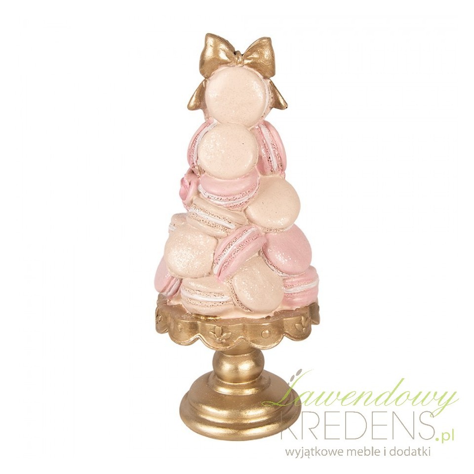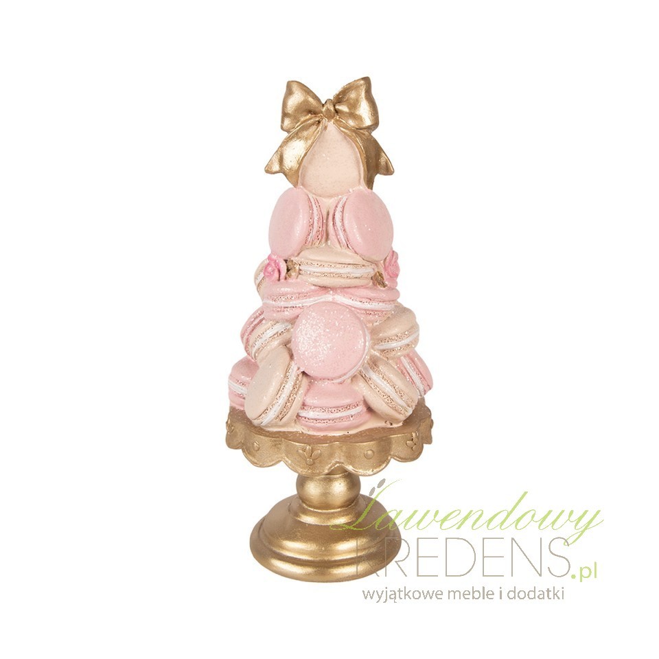 Jeśli chcesz dodać wnętrzu „apetycznego” akcentu, ale bez wrażenia kiczu, ta figurka dekoracyjna babeczki Clayre & Eef rozwiązuje problem pustej półki lub komody jednym, spójnym detalem. Kompozycja przypomina piramidę z makaroników i bezików w pudrowym różu, przełamanym złotą kokardą i złotą podstawą – dzięki temu dekoracja wygląda jak mała rzemieślnicza rzeźba, a nie sezonowy gadżet.Dekoracja w stylu glamour z pastelową paletą i efektem „cukierniczej tekstury”