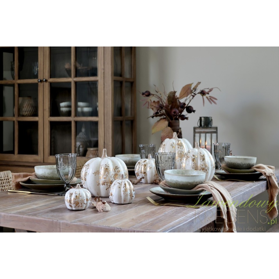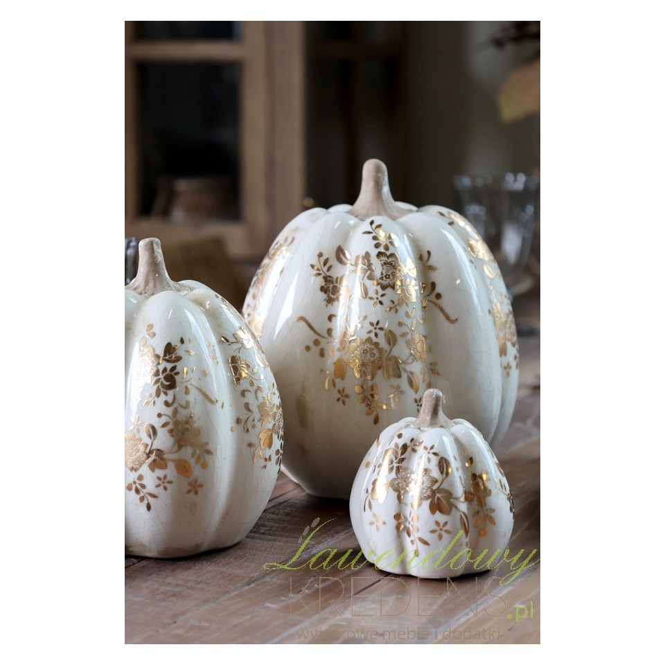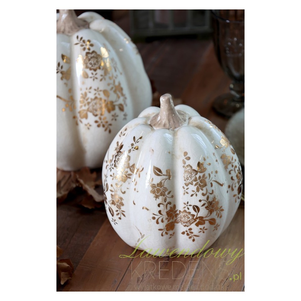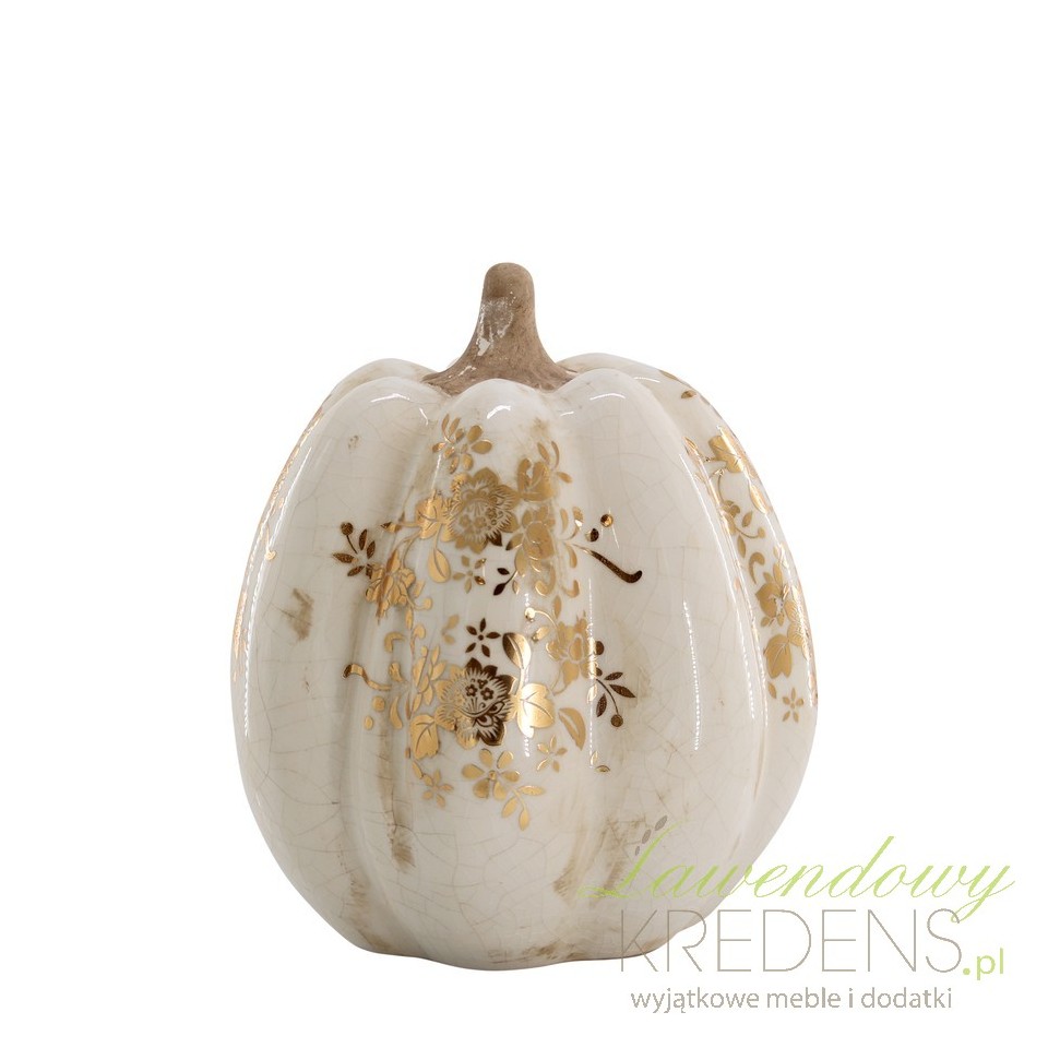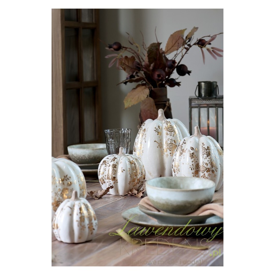 Jeśli chcesz wprowadzić klimat jesieni bez krzykliwych kolorów i plastikowych ozdób, wybierz ceramiczną dynię Melun Chic Antique. To dekoracja w odcieniu złamanej bieli z wyraźną, rzemieślniczą spękaną glazurą (craquelé) i złotymi, florystycznymi zdobieniami. Polecam ją do wnętrz, w których liczy się detal: subtelny połysk, szlachetna faktura i dopracowane wykończenie, które dobrze wygląda zarówno w świetle dziennym, jak i przy świecach.Chic Antique w stylu vintage: postarzany efekt, patyna i złote ornamenty