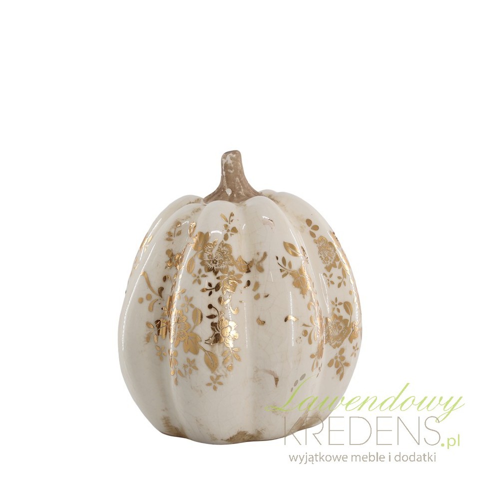 Jeśli chcesz wprowadzić klimat jesieni bez krzykliwych kolorów i sztucznych ozdób, ta ceramiczna dynia Chic Antique rozwiązuje problem „pustej” przestrzeni na stole, komodzie lub parapecie. Model Melun B ma elegancką, rzeźbiarską formę i jasną ceramikę z złotym ornamentem, która odbija światło świec i lamp. Polecam ją do stylu French country, klasycznego, glamour w wersji soft oraz do wnętrz, w których liczy się detal: subtelna patyna, lekko postarzana faktura i dekoracyjna tekstura szkliwa.Postarzane szkliwo i złocenia: dekoracja w stylu vintage, która nie wygląda „sezonowo”