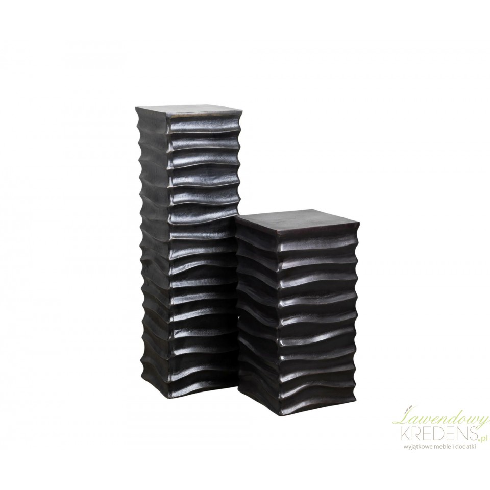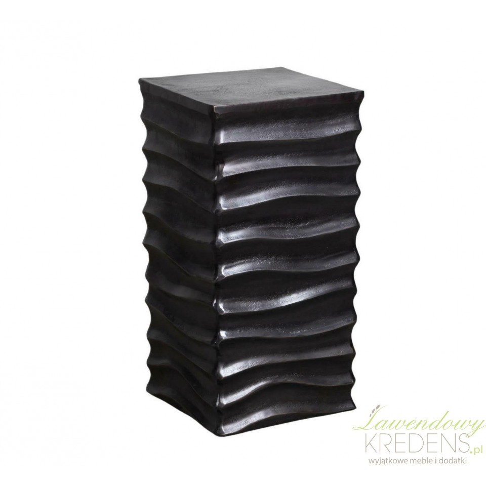 Najmocniejszą cechą tego modelu jest wyrazista, falująca struktura boków. Warstwowe przetłoczenia budują głębię i grę światła, dzięki czemu postument wygląda jak ręcznie kształtowany, z wyczuwalną teksturą i subtelną, surową patyną. To nie jest gładki, „hotelowy” klocek – to dekoracja o charakterze: pasuje do wnętrz rustykalnych, loftowych, japandi z czernią, a także do eklektycznych aranżacji, gdzie liczy się kontrast.Stabilna podstawa pod wysoką roślinę, rzeźbę lub wazon