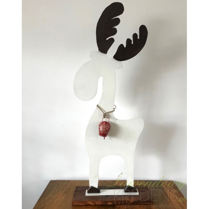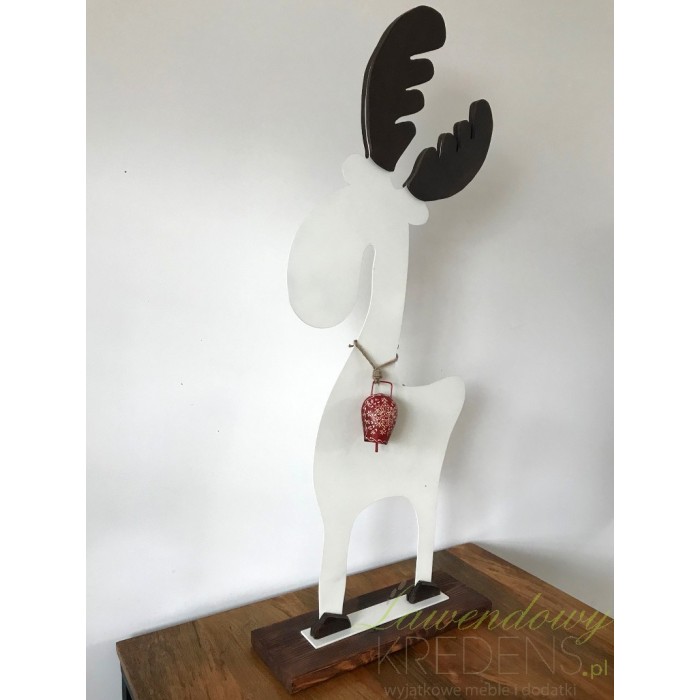 Łoś ozdobny ma biały kolor i czarne rogi. Jest ustawiony na prostokątnej podstawie i ma na szyi czerwony dzwoneczek. Łoś jest wysoki na ponad 100 centymetrów dlatego nie da się przejść obok niego obojętnie. Wykorzystaj go do dekoracji kominka lub komody. To dodatek, bez którego nie obejdą się Święta Bożego Narodzenia.