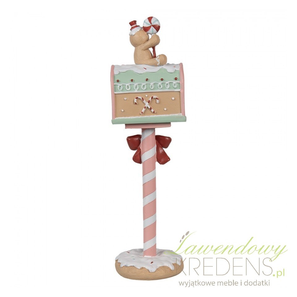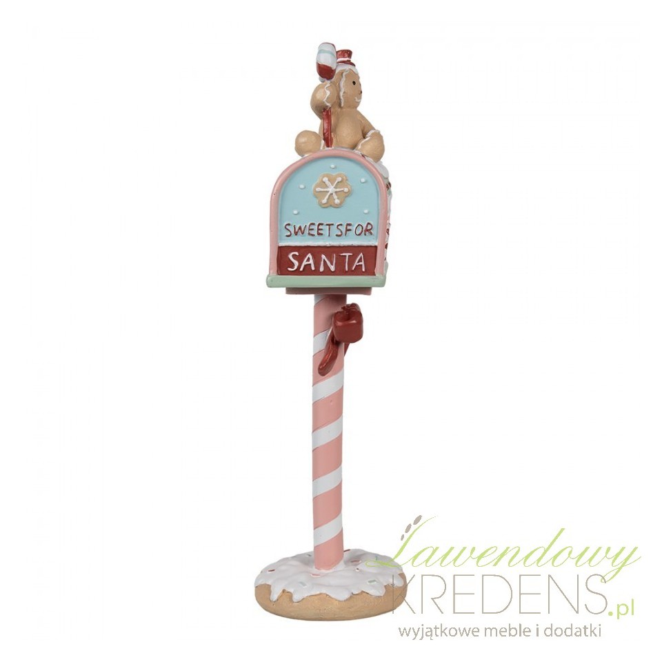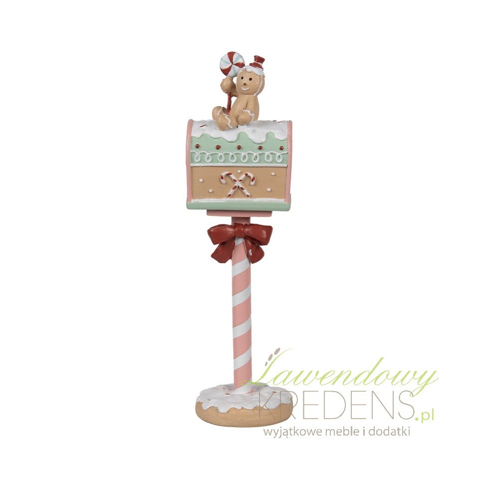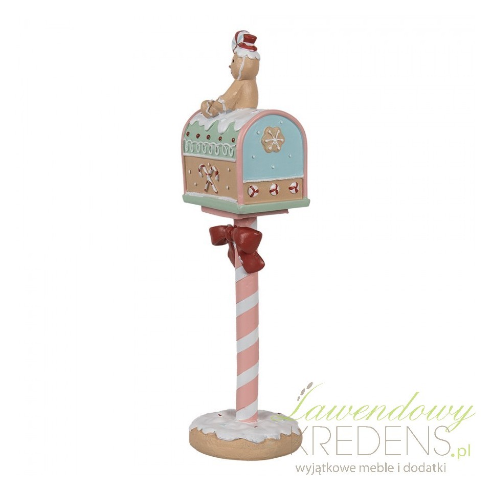 Ludzik z piernika siedzący na wysokiej skrzynce na listy ze świątecznymi detalami to dekoracja podkreślająca klimat Świąt Bożonarodzeniowych. Słodkość tej figurki przykuje wzrok każdego gościa w Twoim domu.