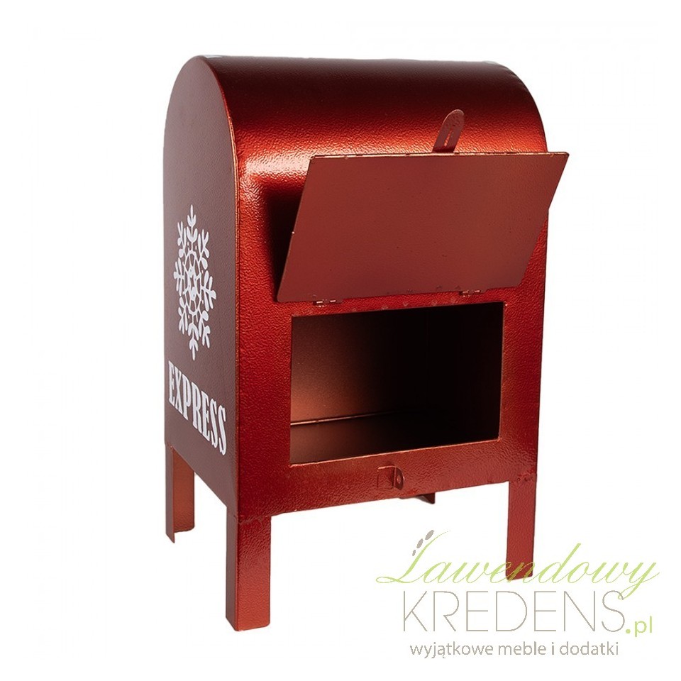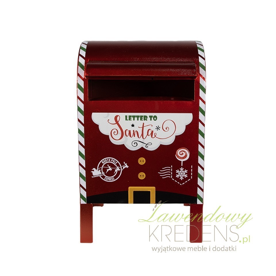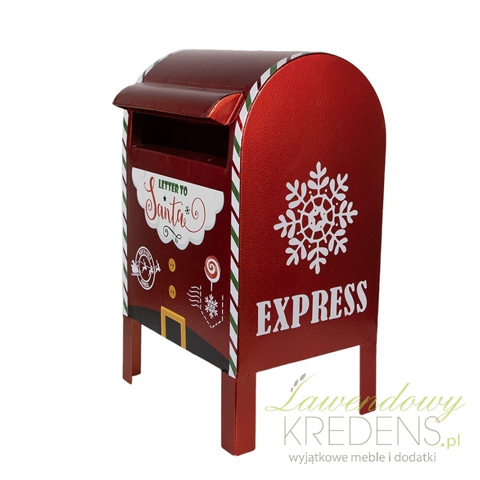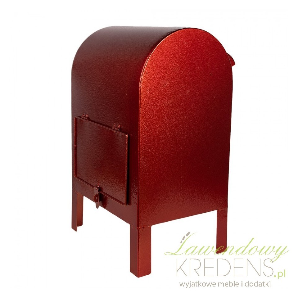 Czerwona metalowa skrzynka na listy w świątecznym klimacie to uroczy i funkcjonalny dodatek, który wnosi do otoczenia magiczną atmosferę świąt. Skrzynka może być ciekawym pomysłem, aby ozdobić ogró lub może się przydać do zabawy dla dzieci w wysyłanie listów do Świętego Mikołaja.