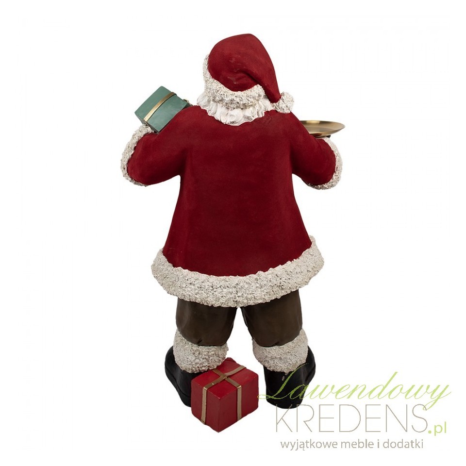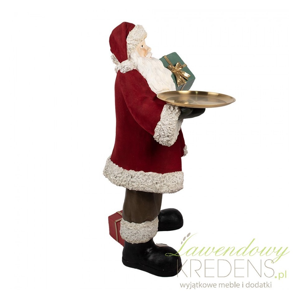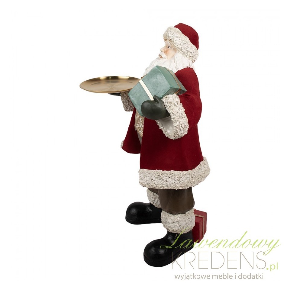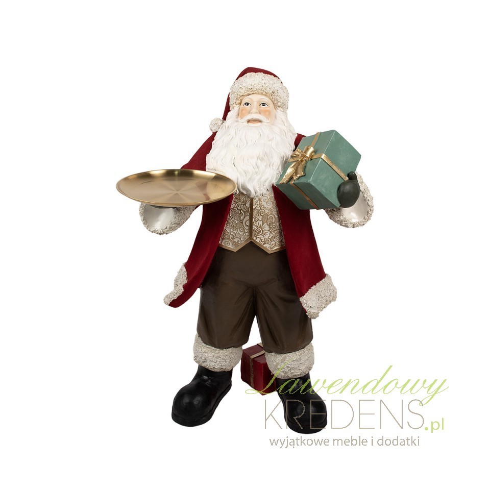 Klimatyczna figura Świętego Mikołaja, który w jednej ręce trzyma prezent, a w drugiej złotą tacę. Clayre & Eef proponuje naprawdę bogatą ofertę świątecznych i praktycznych dekoracji.