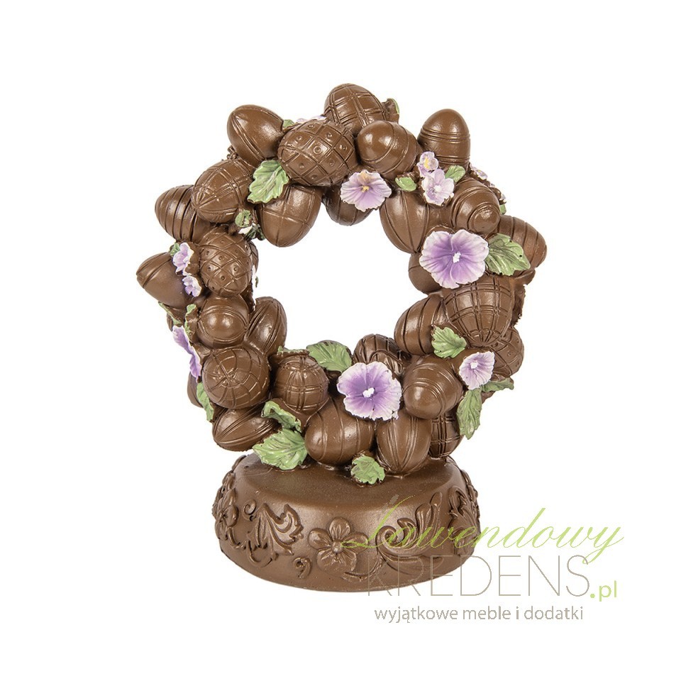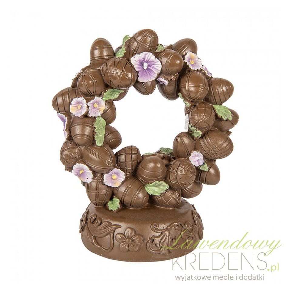 Jeśli chcesz stworzyć świąteczny klimat, ale nie masz czasu na stroiki z żywych kwiatów, ta figurka rozwiązuje problem „pustego stołu”. **Figurka Jajka Czekoladowe Wielkanoc A Clayre & Eef** wygląda jak wianek ułożony z czekoladowych jajek, liści i drobnych kwiatów. Daje efekt dopracowanej aranżacji bez podlewania, bez osypywania i bez ryzyka, że dekoracja „siądzie” po jednym dniu.Wianek z jajek w stylu shabby chic – faktura, relief i rękodzielniczy charakter