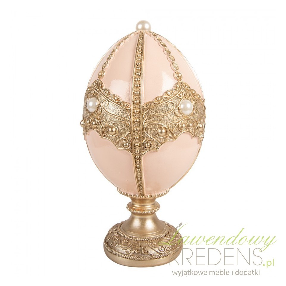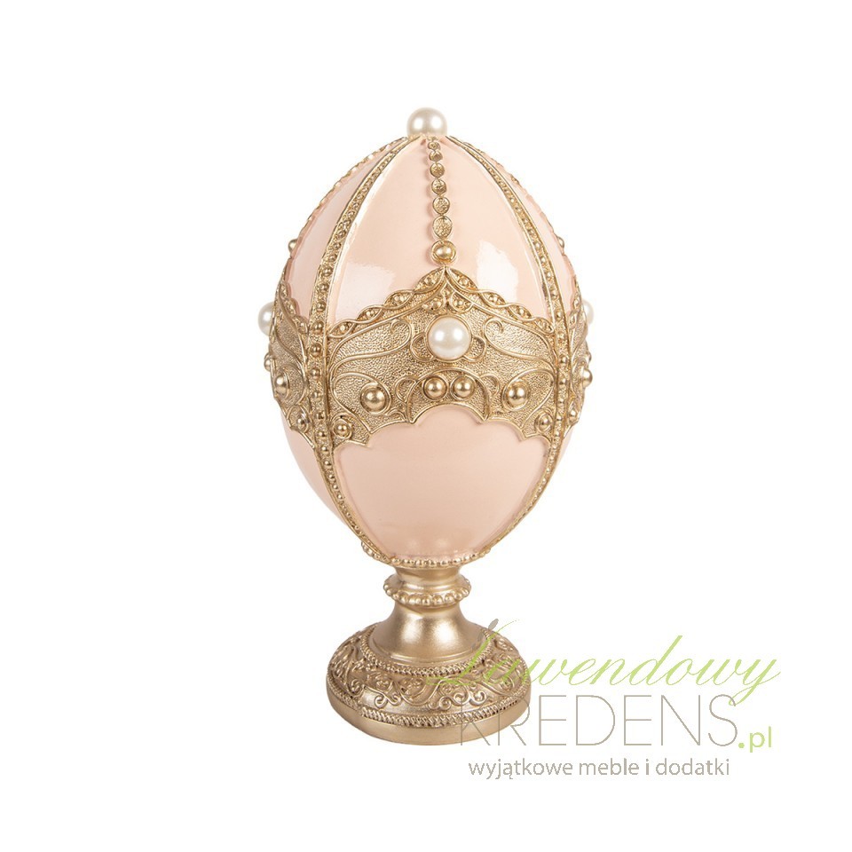 Wielkanocne dodatki często przewracają się przy serwetkach, świecach czy dzieciach przy stole. Tutaj pomaga szeroka nóżka, która stabilizuje całość i pozwala bez stresu ustawić ozdobę w ciągu komunikacyjnym. Owalna bryła przyciąga wzrok jak klasyczne jajko „w stylu Fabergé”, a metaliczne złoto i perłowe akcenty dodają biżuteryjnego charakteru bez przesady.Styl glamour z patyną – do aranżacji klasycznych, romantycznych i vintage