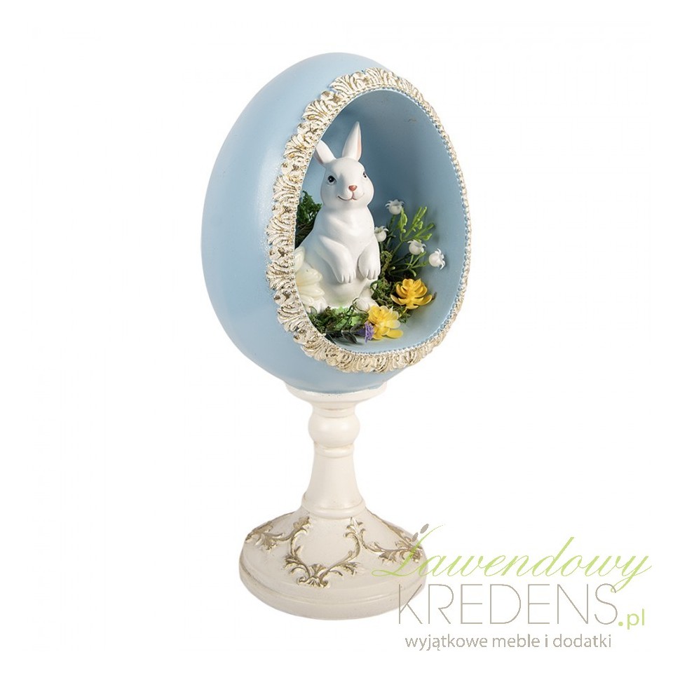 Jeśli szukasz eleganckiej ozdoby wielkanocnej, która natychmiast porządkuje aranżację stołu lub komody, wybierz jajko Clayre & Eef na stabilnej nóżce. Forma jak mini gablotka eksponuje króliczka wśród kwiatów, więc nie potrzebujesz dodatkowych stroików ani świec, by uzyskać efekt „wow”.Figurka króliczka w jajku – gotowy stroik bez układania kompozycji