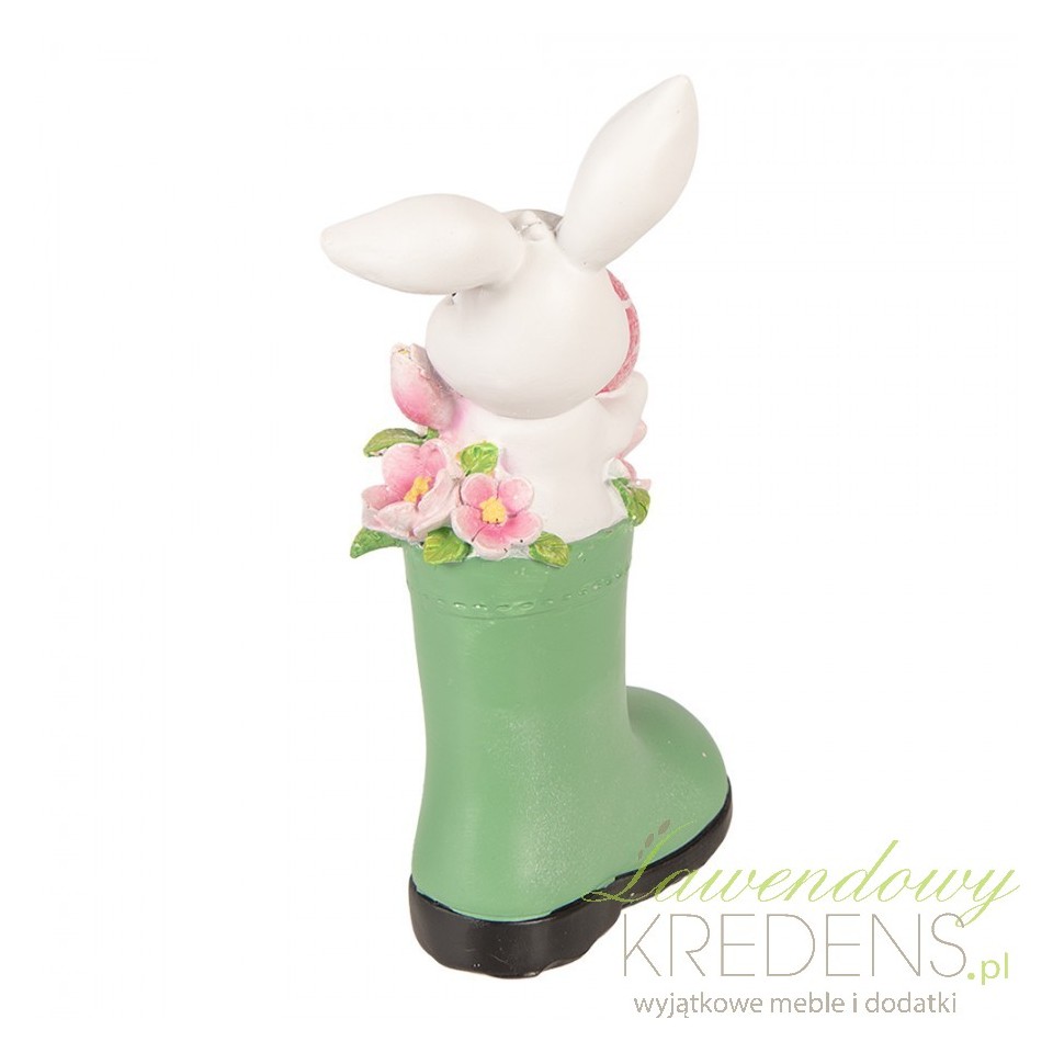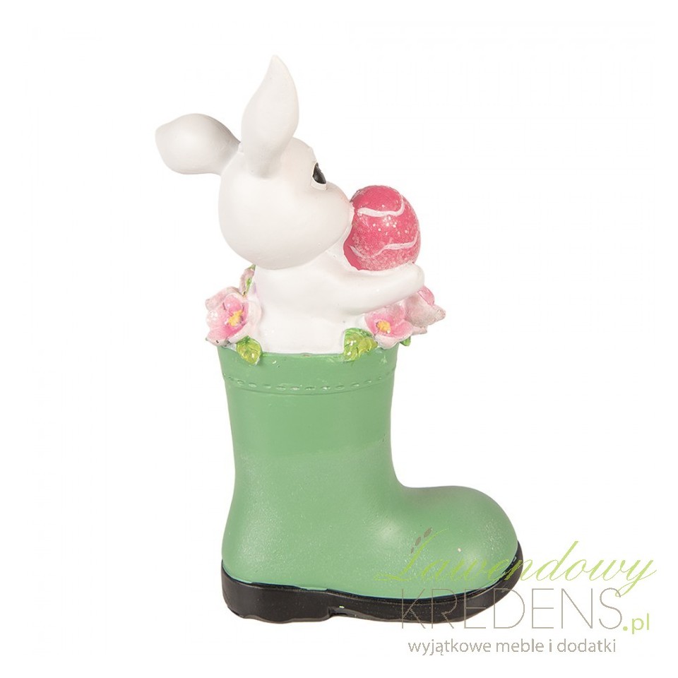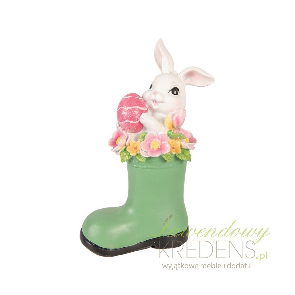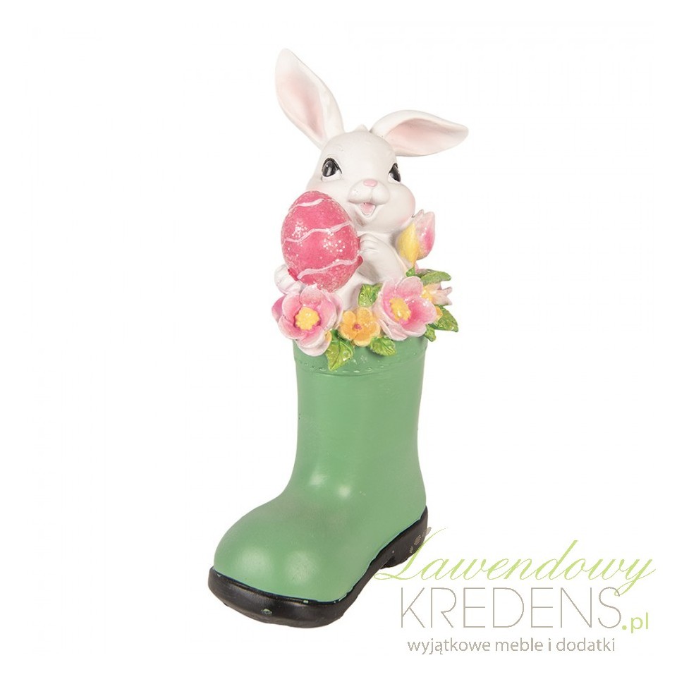 Jeśli chcesz szybko zbudować świąteczny klimat, ale nie masz czasu na skomplikowane kompozycje, ta figurka rozwiązuje problem w jednym kroku. Dekoracja na Wielkanoc Królik B Clayre & Eef łączy motyw zajączka, pisanki i wiosennych kwiatów w spójną, gotową ozdobę. Wystarczy postawić ją na komodzie, stole lub parapecie, by cała aranżacja „zaskoczyła”.Wiosenna figurka królika w kaloszu – pastelowa paleta i rzemieślnicza faktura