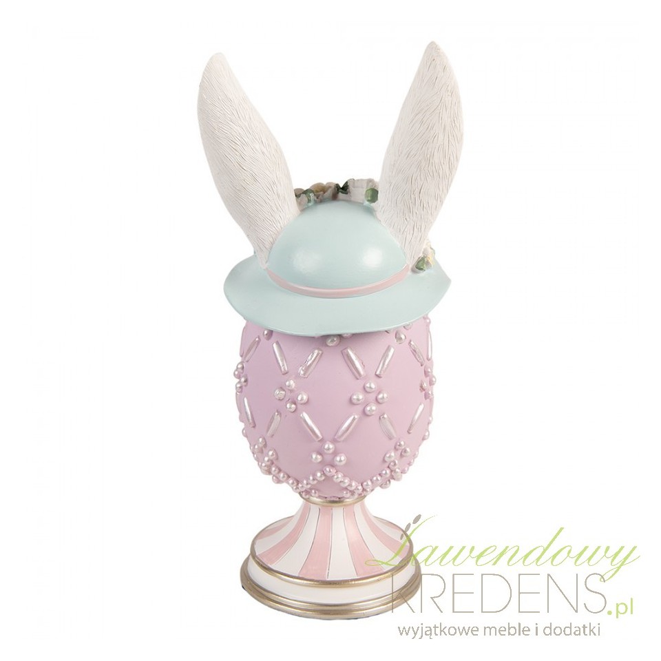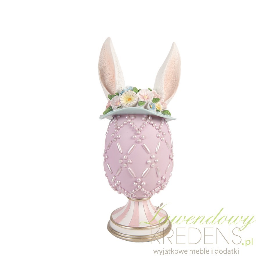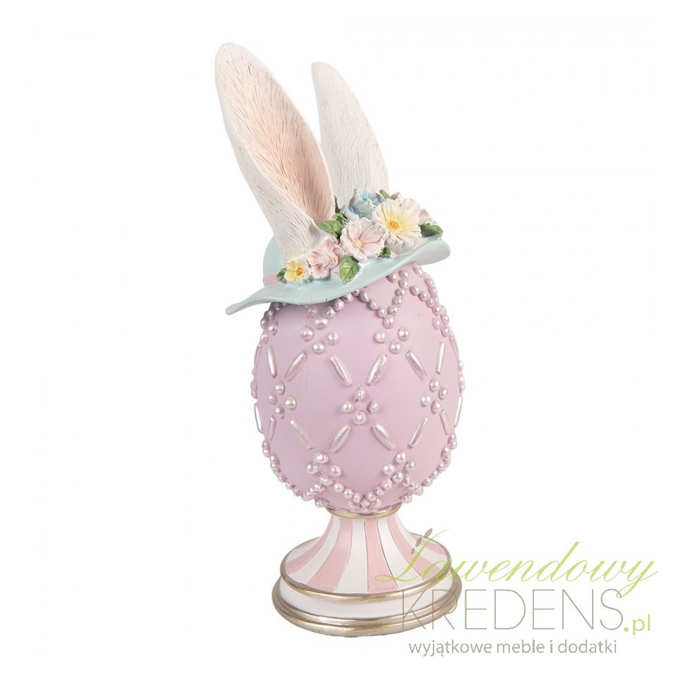 Wielkanocne ozdoby często przewracają się przy nakryciu stołu albo giną wśród zastawy. Ten model rozwiązuje problem dzięki podwyższeniu: nóżka działa jak mini-postument i porządkuje aranżację. Szeroka, wyraźnie zaznaczona stopa ułatwia bezpieczne ustawienie dekoracji na bieżniku, komodzie czy półce. Dzięki temu nie musisz „ratować” kompozycji w ostatniej chwili – jajko trzyma pion i wygląda reprezentacyjnie nawet w ciasnej strefie jadalni.Perłowe zdobienia i uszka króliczka – detal, który podbija styl glamour i pastelową Wielkanoc