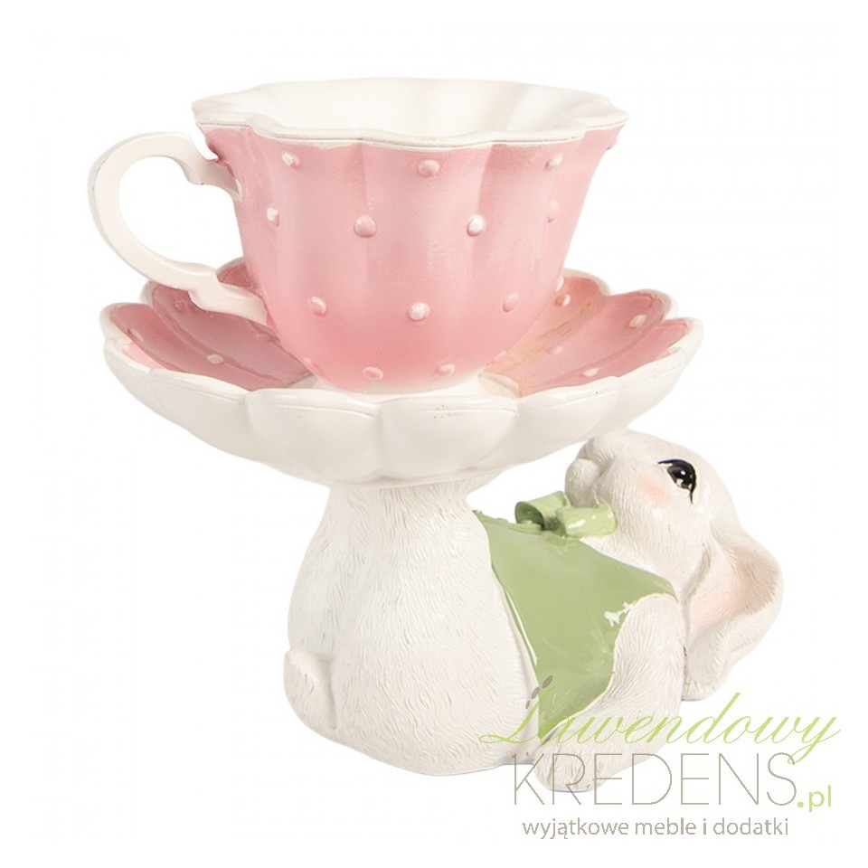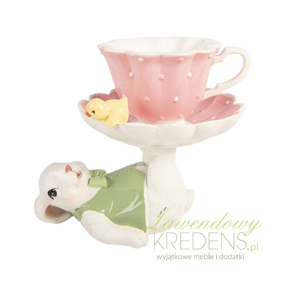 Jeśli przed świętami masz wrażenie, że Twojemu wnętrzu brakuje „kropki nad i”, ta figurka ozdobna Królik Pastelowa Wielkanoc Clayre & Eef rozwiązuje problem w kilka minut. To dekoracja w stylu romantyczno-vintage: biały królik w zielonej kamizelce tworzy stabilną podstawę dla pastelowej czarki, a drobny żółty kurczaczek dodaje scenie wielkanocnego charakteru. Polecam ją szczególnie tam, gdzie liczy się efekt „wow” bez przebudowy całej aranżacji – na stole, komodzie, konsoli lub w witrynie.Pastelowa czarka na króliku jako stojak na pisanki, słodycze lub drobne dekoracje