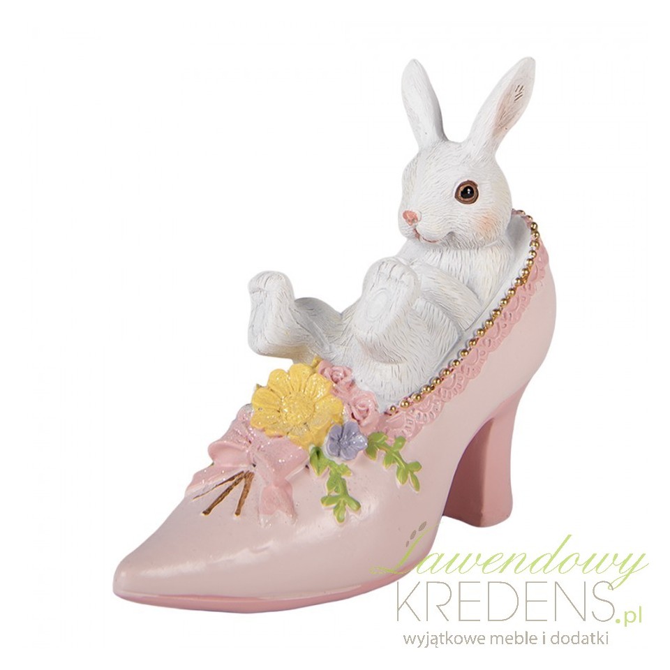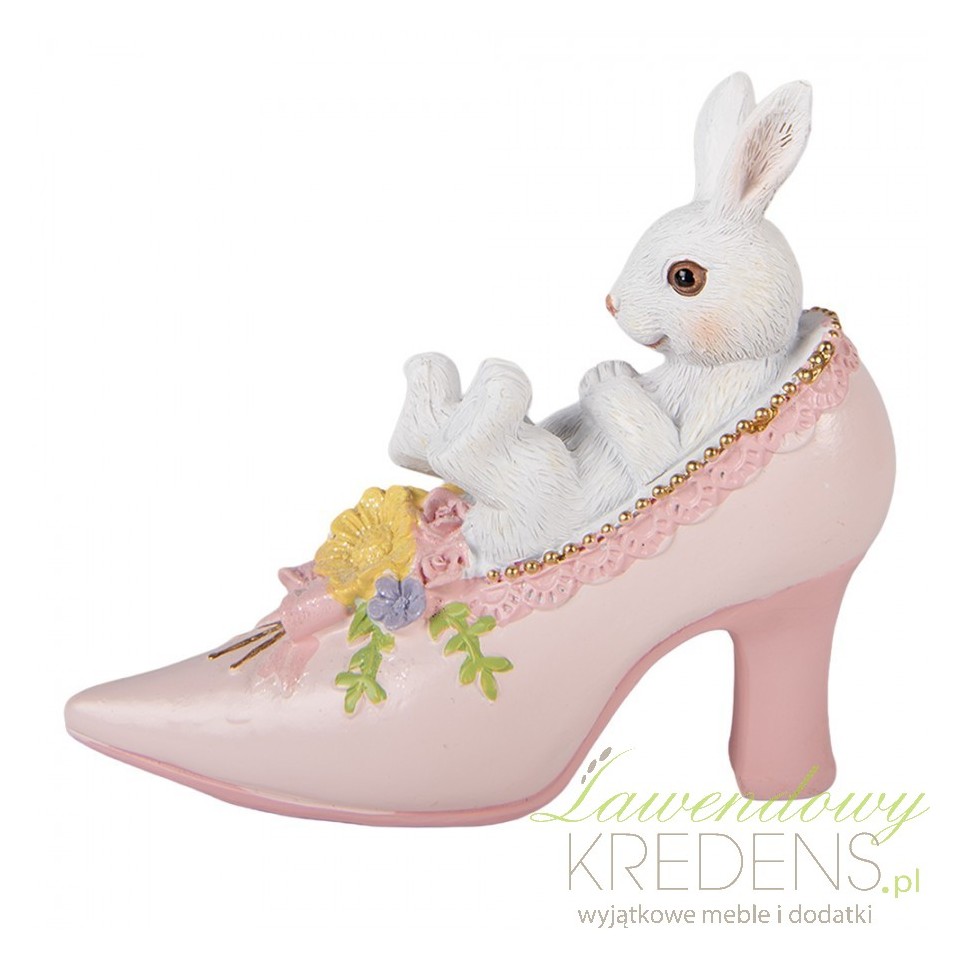Jeśli co roku brakuje Ci jednego elementu, który „spina” wielkanocną aranżację bez przebudowy całego wnętrza, ta figurka ozdobna Królik Pastelowa Wielkanoc W Clayre & Eef rozwiązuje problem od ręki. Zamiast kolejnych pisanek i wianków dostajesz dopracowany detal: biały królik usadowiony w pastelowym pantofelku na obcasie. Taka forma natychmiast buduje klimat – lekki, wiosenny, a jednocześnie elegancki. Ustaw ją solo lub jako centralny punkt na konsoli, komodzie czy stole w jadalni.Pastelowy pantofelek z florystycznym detalem – romantyczny akcent w stylu shabby chic