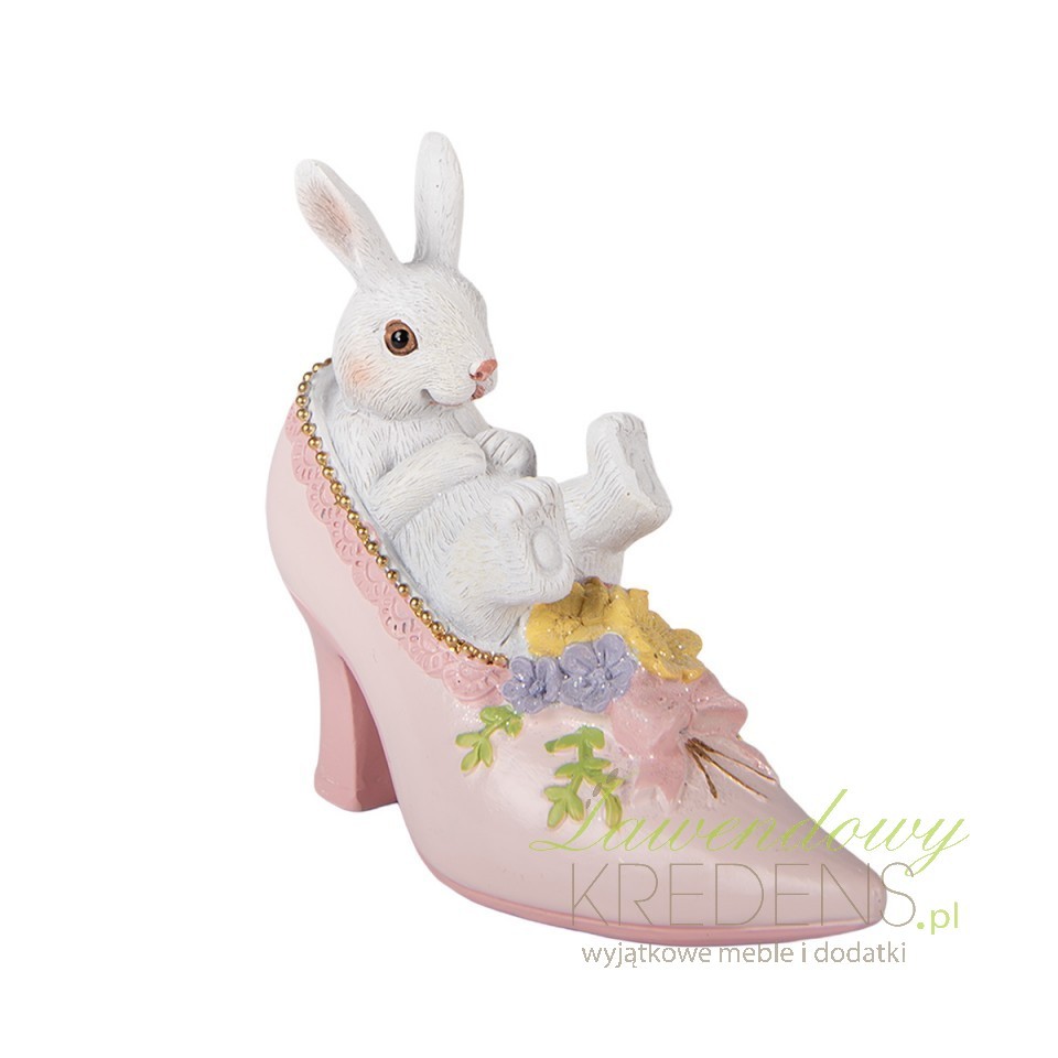 Figurka ozdobna królik w pastelowym bucie – gotowa dekoracja wielkanocna do salonu i jadalni