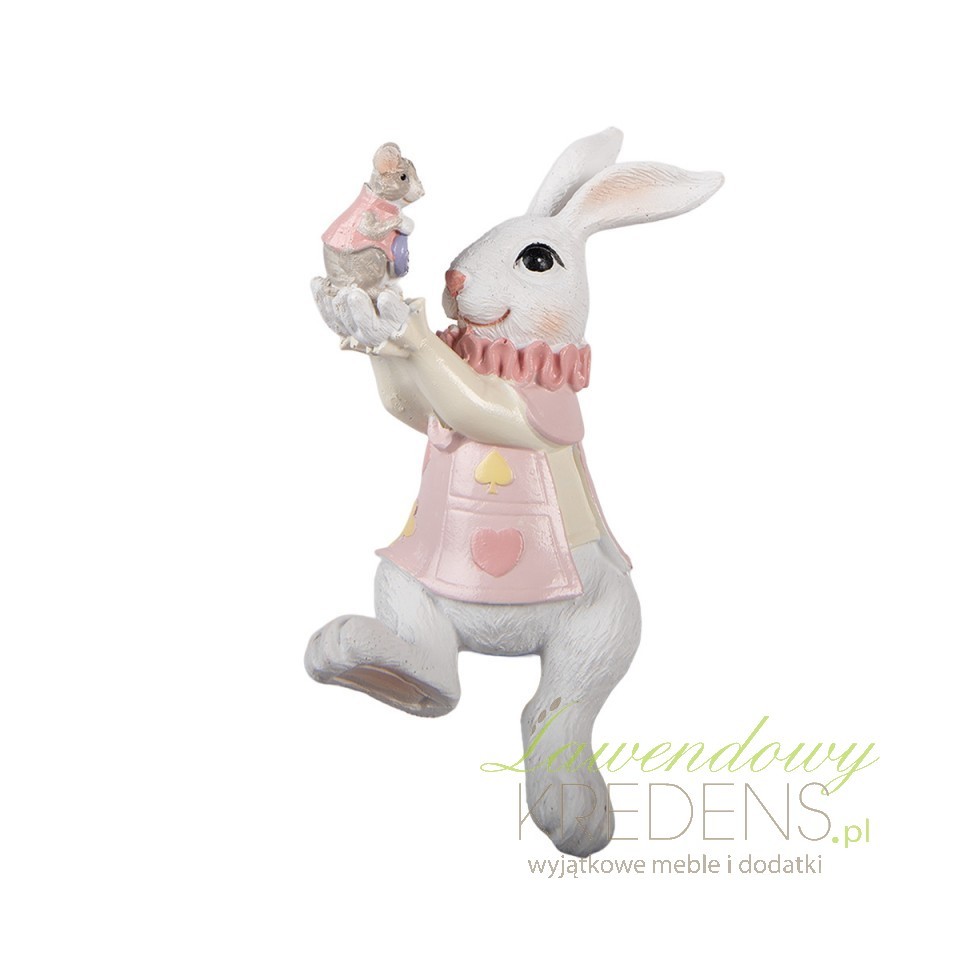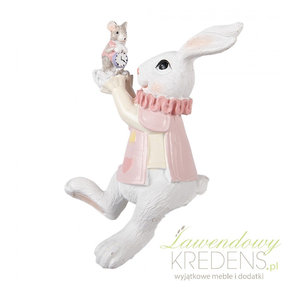 Jeśli chcesz wprowadzić do wnętrza wyrazisty akcent Wielkanocy, który nie wygląda jak masowa ozdoba z marketu, wybierz figurkę „Królik Pastelowa Wielkanoc Y” marki Clayre & Eef. To dekoracja w stylu shabby chic: jasna kolorystyka, delikatnie „cukierkowe” pastele i rzemieślnicza tekstura z subtelnym efektem postarzenia. Królik w różowym stroju trzyma małą myszkę – ta scena dodaje aranżacji narracji, dzięki czemu ozdoba pracuje jak mała opowieść na komodzie, wśród pisanek, na konsoli w korytarzu czy w witrynie sklepowej.Ozdoba na Wielkanoc, która rozwiązuje problem „pustej komody” i nudnego stroika