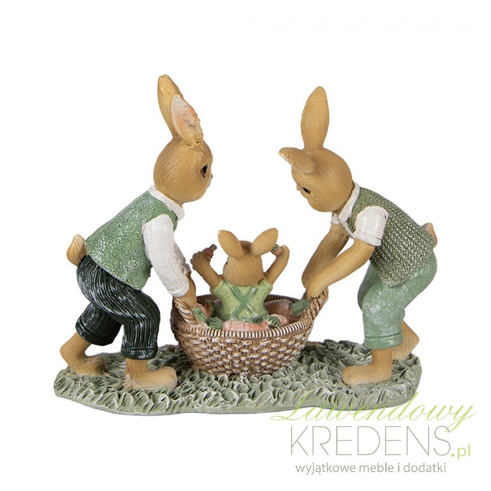 Jeśli przed Wielkanocą brakuje Ci jednego elementu, który „spina” aranżację i od razu buduje świąteczny klimat, sięgnij po dekorację Na Wielkanoc Zające F Clayre & Eef. Figurka z rodzinną scenką króliczków przy koszyku wprowadza ciepło i narrację – nie wygląda jak przypadkowy bibelot, tylko jak przemyślany detal wystroju. Polecam ją do wnętrz, w których stawiasz na przytulność i domowy charakter: od klasyki po styl rustykalny i cottage.Rzemieślnicza faktura i postarzany urok do stylu rustykalnego