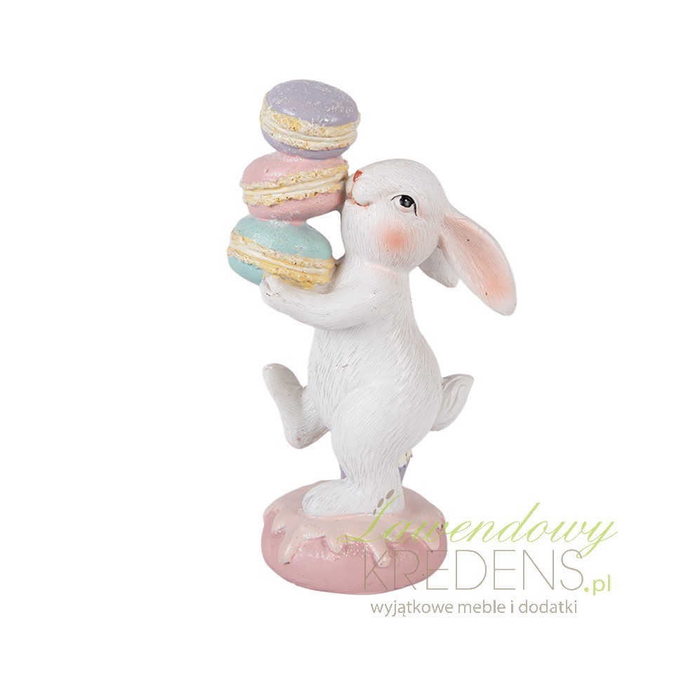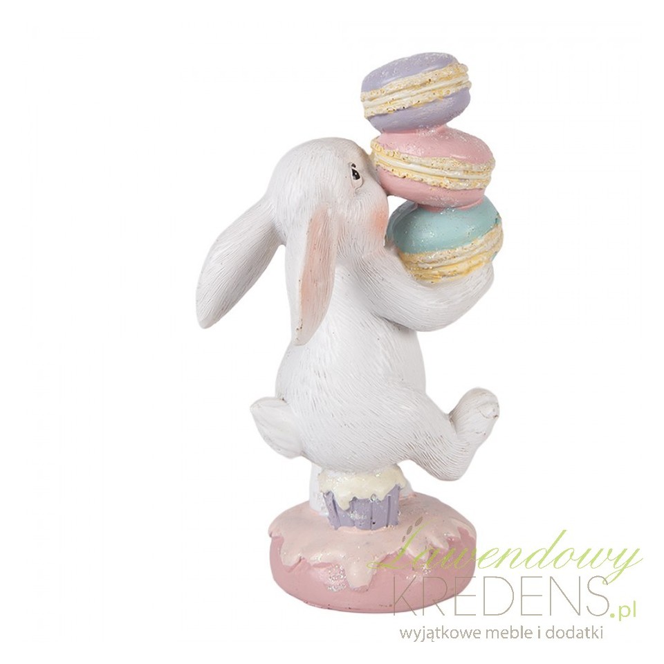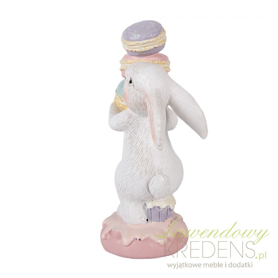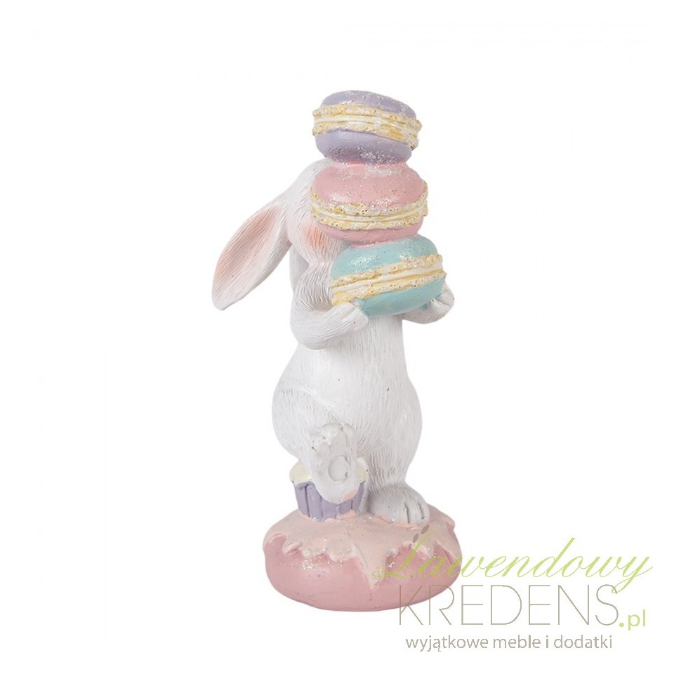 Jeśli przygotowujesz dom na Wielkanoc i brakuje Ci jednego, mocnego akcentu, który spina całą kompozycję, ta figurka dekoracyjna królika w pastelach rozwiązuje problem w kilka sekund. Ustaw ją na stole, komodzie lub parapecie, a od razu budujesz klimat: lekko cukierniczy, wiosenny, pełen światła. Królik trzyma kolorowe makaroniki, więc dekoracja działa jak „temat przewodni” – łatwo dobierzesz do niej serwetki, świeczniki, szkło w odcieniach pudrowego różu, mięty i lawendy.Pastelowe makaroniki i subtelne cieniowanie – dekoracja w stylu romantycznym i cottage