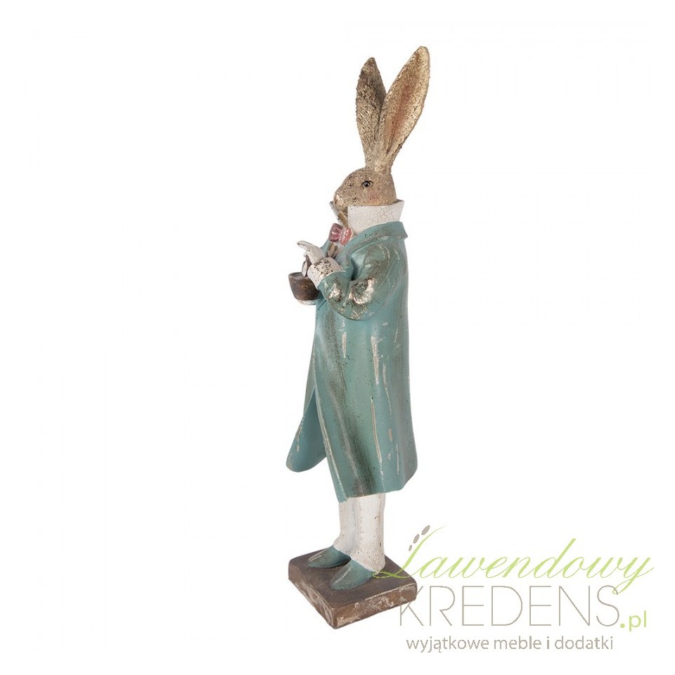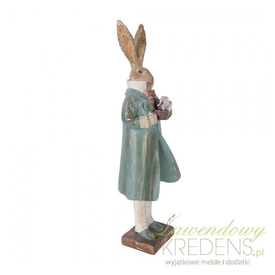 Jeśli chcesz wprowadzić Wielkanoc do wnętrza bez przesytu plastikowymi ozdobami, wybierz figurkę, która wygląda jak z rzemieślniczej pracowni. Dekoracja na Wielkanoc Królik T Clayre & Eef łączy klimat klasycznej bajki z elegancją: królik w długim płaszczu trzyma małą miseczkę, więc natychmiast buduje scenę, a nie tylko „staje na półce”. Polecam go, gdy zależy Ci na stylizacji, która pasuje do jadalni, komody w przedpokoju albo ekspozycji sklepowej i nie gryzie się z porcelaną, szkłem czy naturalnym drewnem.Postarzany styl vintage: patyna, tekstura i ręcznie wyglądające wykończenie