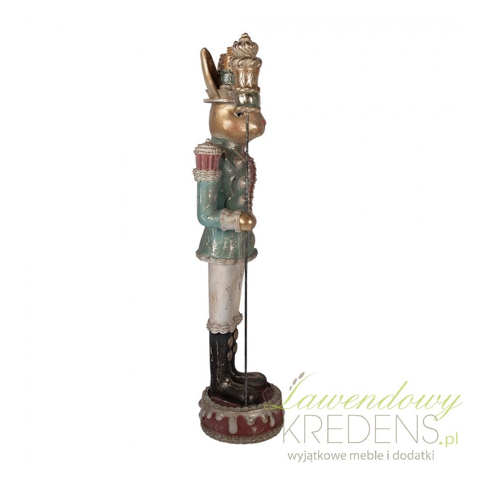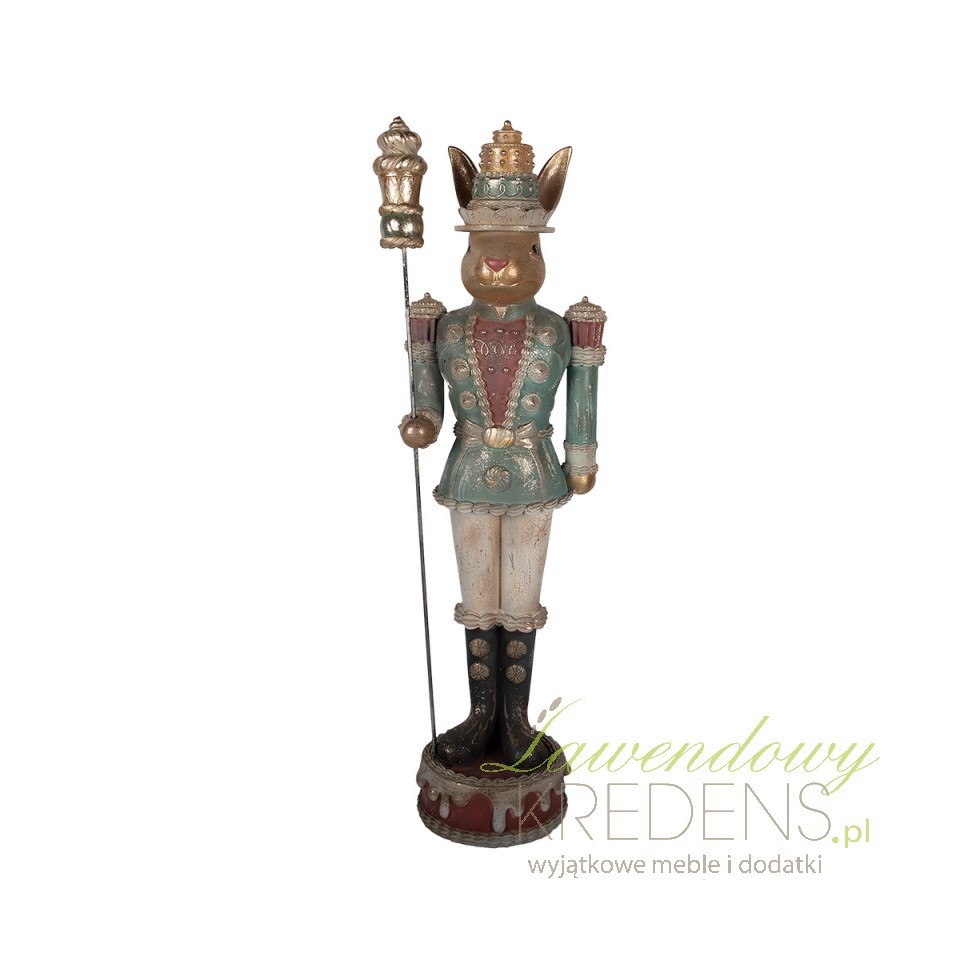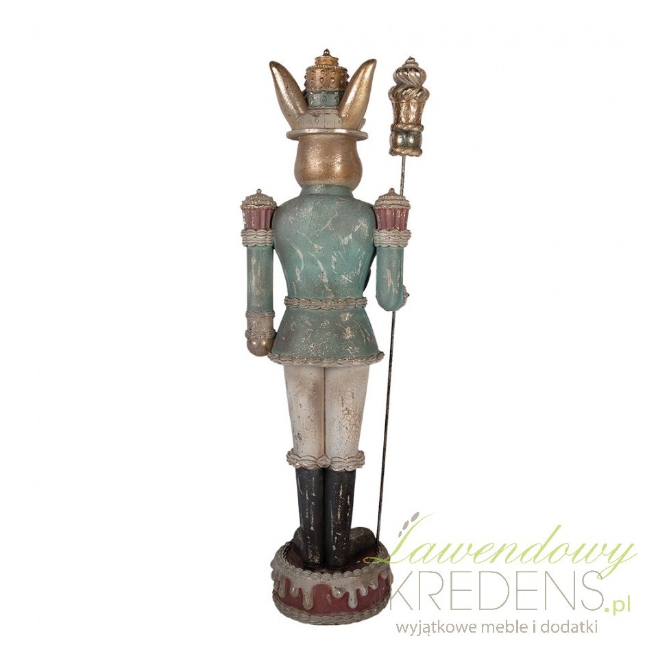 Wprowadź do wnętrza nutę bajkowej elegancji. Wysoka figura zająca w ubraniu marki Clayre & Eef przyciąga wzrok dopracowanymi detalami: królewskim nakryciem głowy, stylizowanym uniformem i dekoracyjnym berłem. To ozdoba, która buduje opowieść – sprawdzi się zarówno w klasycznych aranżacjach, jak i w modnym stylu vintage czy cottagecore. Idealna, gdy szukasz elementu „wow” do salonu, holu lub witryny.Efektowny akcent do domu i przestrzeni komercyjnych