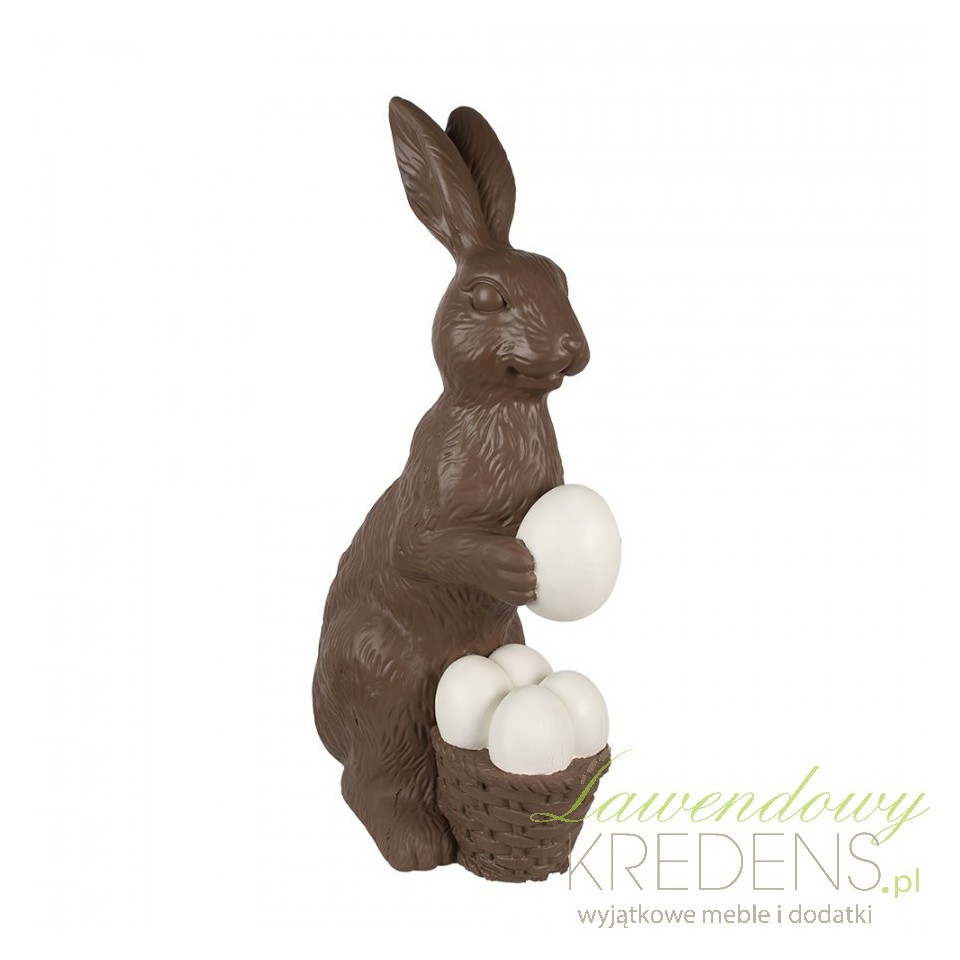 Duża figurka zająca Clayre & Eef w czekoladowym wykończeniu to ozdoba, która natychmiast buduje świąteczny klimat. Zając z koszykiem i jajkami przyciąga wzrok realistyczną fakturą futerka i dopracowanymi detalami, dzięki czemu wygląda jak elegancki element scenografii, a nie zwykła dekoracja. To idealny wybór, jeśli chcesz stworzyć aranżację wielkanocną premium w stylu klasycznym, rustykalnym lub cottage.Styl, który pasuje do wielu aranżacji