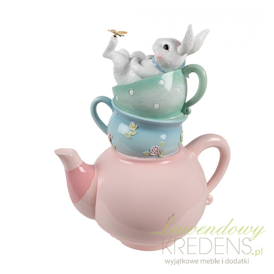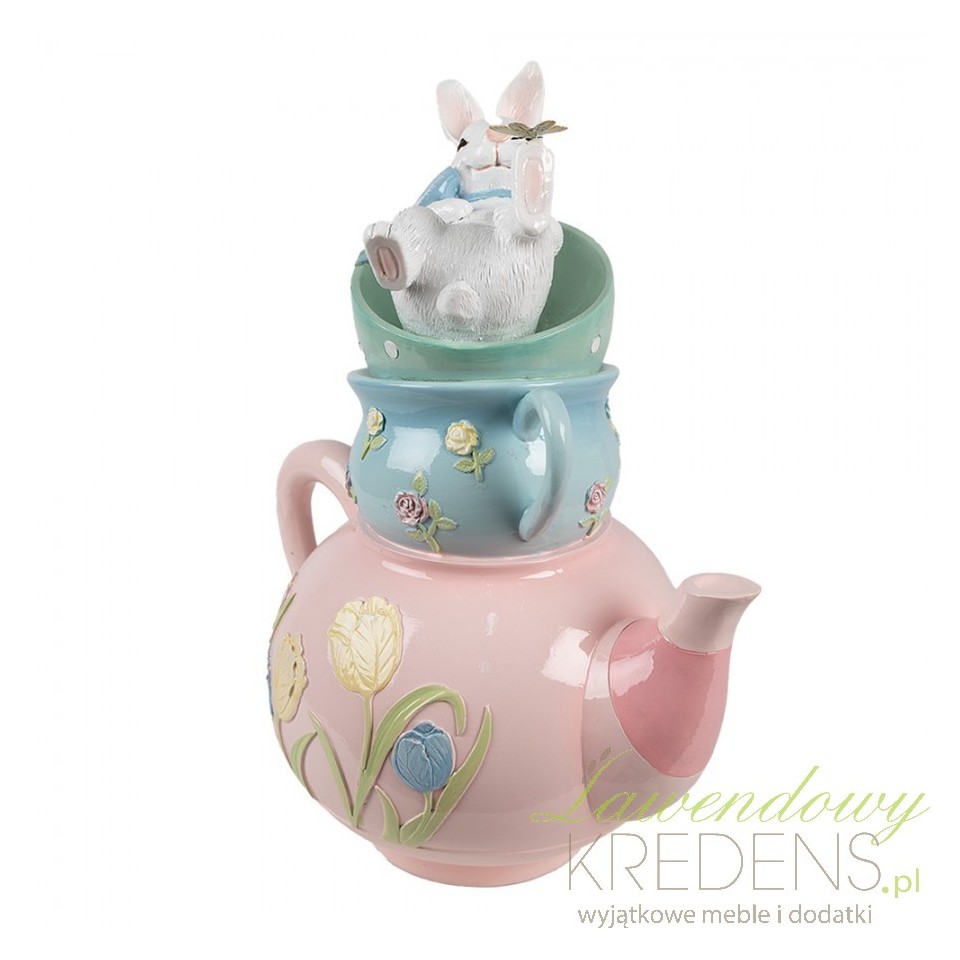Figurka ozdobna z uroczym królikiem zanurzonym w pastelowej kompozycji filiżanek i czajniczka to dekoracja, która od razu buduje w domu ciepły, świąteczny nastrój. Motywy wiosennych kwiatów, delikatne zdobienia i bajkowa scena zajączka sprawiają, że całość wygląda jak wyjęta z wielkanocnej opowieści. To idealny wybór, jeśli szukasz dodatku, który przyciąga wzrok i subtelnie podkreśla charakter wnętrza.