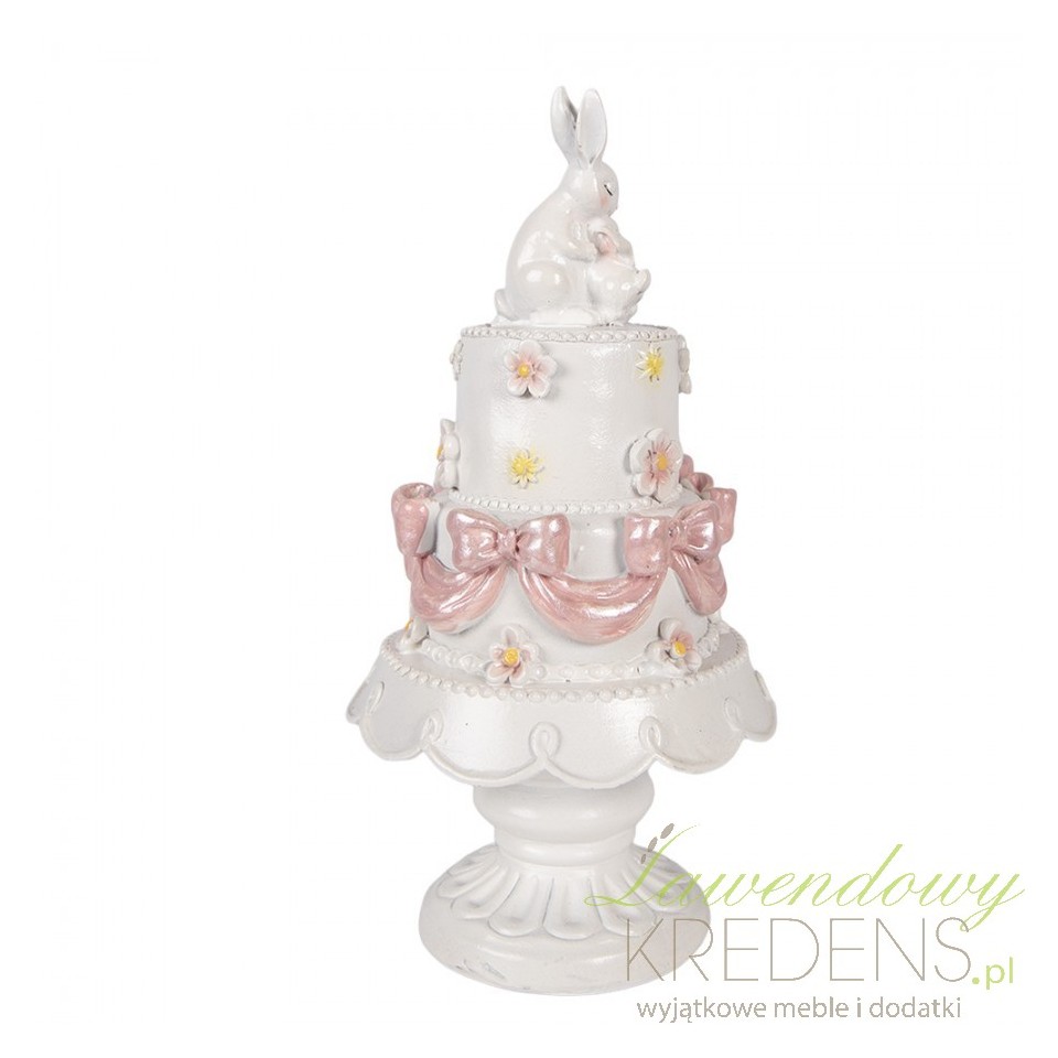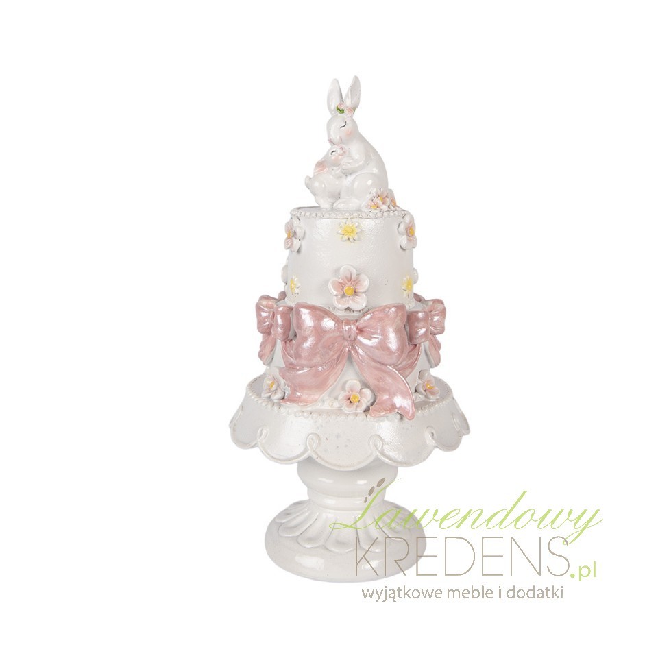Figurka „Tort” Clayre & Eef to efektowny akcent, który wprowadza do wnętrza lekko romantyczny, wiosenny klimat. Kompozycja przypomina elegancki, piętrowy wypiek – zdobiony kokardami i drobnymi kwiatami – a całość wieńczy uroczy motyw zajączków. Dzięki temu dekoracja łączy w sobie